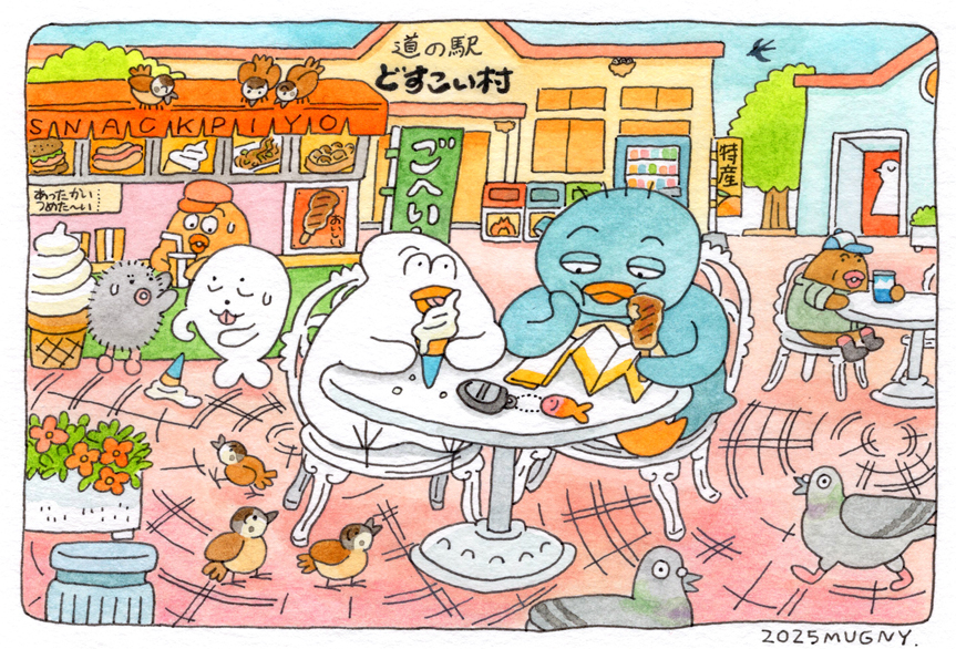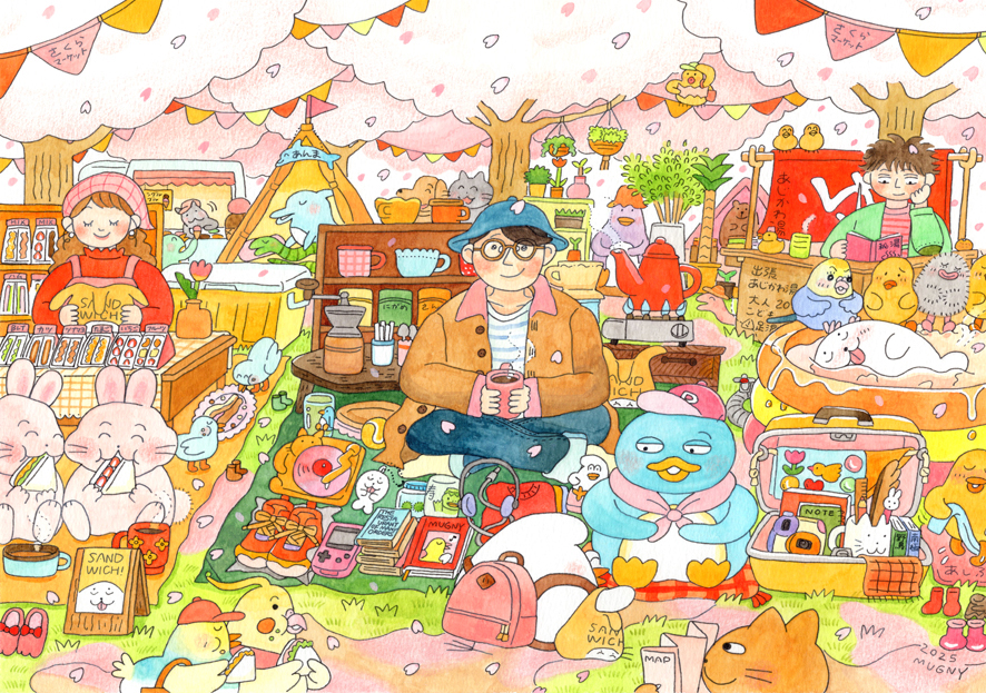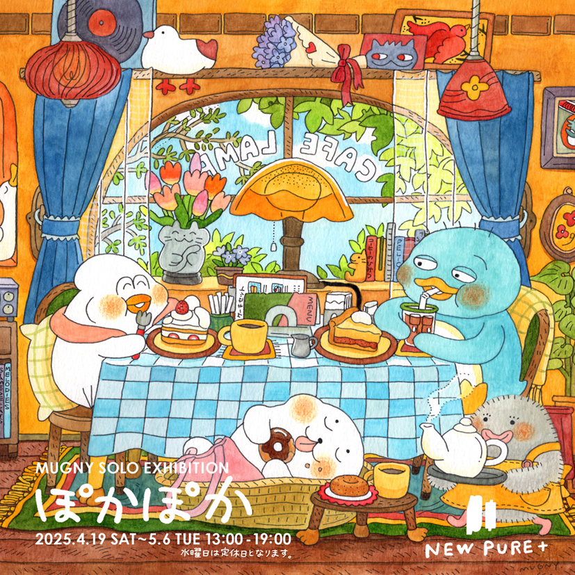 LINEスタンプから飛び出して様々なフォーマットで愛されるキャラクター「とりもち」の作者として知られ、書籍のイラスト、キャラクター・デザインなども手掛けるmugnyが、ソロ・エキシビション「ぽかぽか」を4月19日(土)から5月6日(火・振休)まで大阪・北浜 NEW PURE+にて開催。