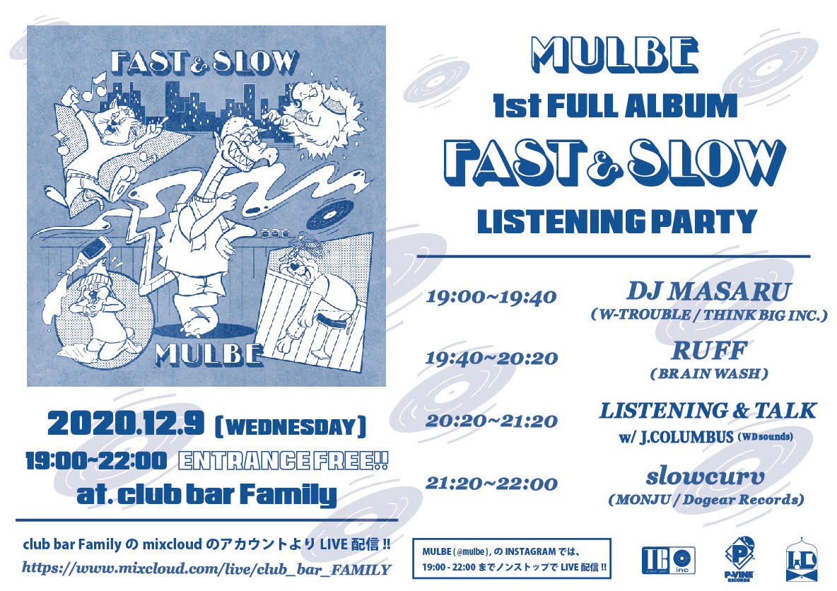 また、発売を記念して12月9日(水)19:00より入場無料のリスニング・パーティ「MULBE Presents 1st Album “FAST & SLOW” Listening Party」を東京・渋谷 club bar FAMILYにて開催。ゲストDJにDJ MASARU、RUFF、SLOWCURVを迎え、J.COLUMBUS aka Lil MERCY(WDsounds)とのトークも予定されています。Mixcloudでの配信も実施。