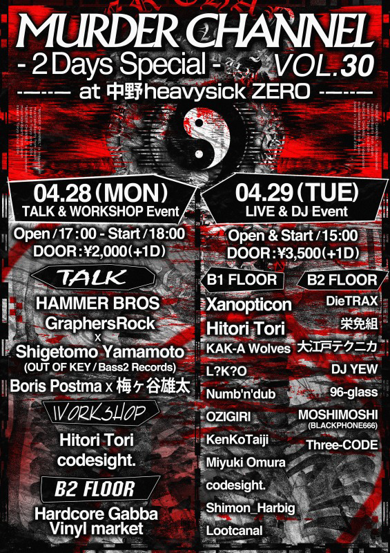 ハードコア・テクノ / ガバやブレイクコアをはじめとするエクストリームなエレクトロニック・ミュージックを中心に取り扱いつつ、様々なサブジャンルとのクロスオーヴァーも推進し、昨年創業20周年を迎えた梅ヶ谷雄太主宰レーベル「Murder Channel」が、ナンバリング・イベント「MURDER CHANNEL」の第30回を4月28日(月・祝前日)、29日(火・祝)の2日間に亘って東京・中野 heavysick ZEROにて開催。