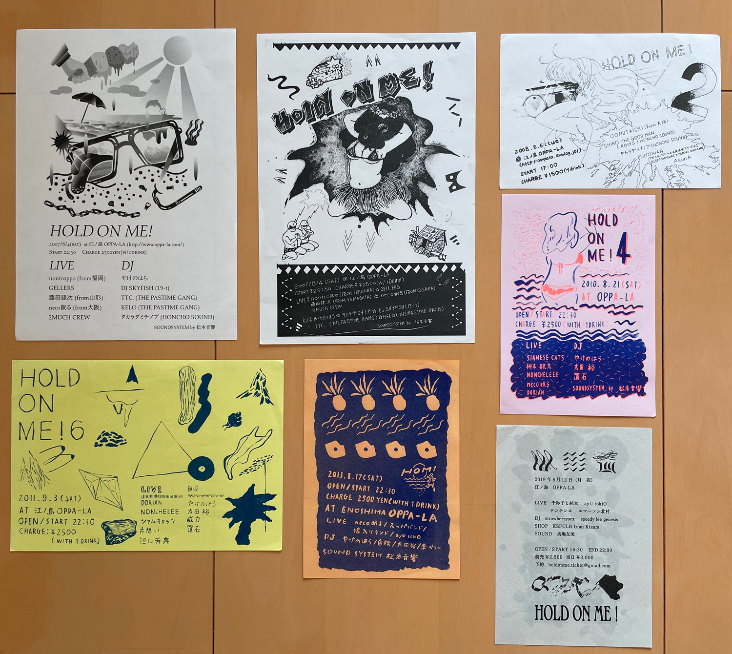 * 5 「Hold on me!」初回は2007年8月4日(土)に開催。nontroppo、GELLERS、藤田建次、neco眠る、2MUCH CREWがライヴ、やけのはら、タカラダミチノブ(HONCHO SOUND)、DJ SKYFISH(19-t)、TTC.(THE PASTIME GANG)、KELO(THE PASTIME GANG)がDJで出演。