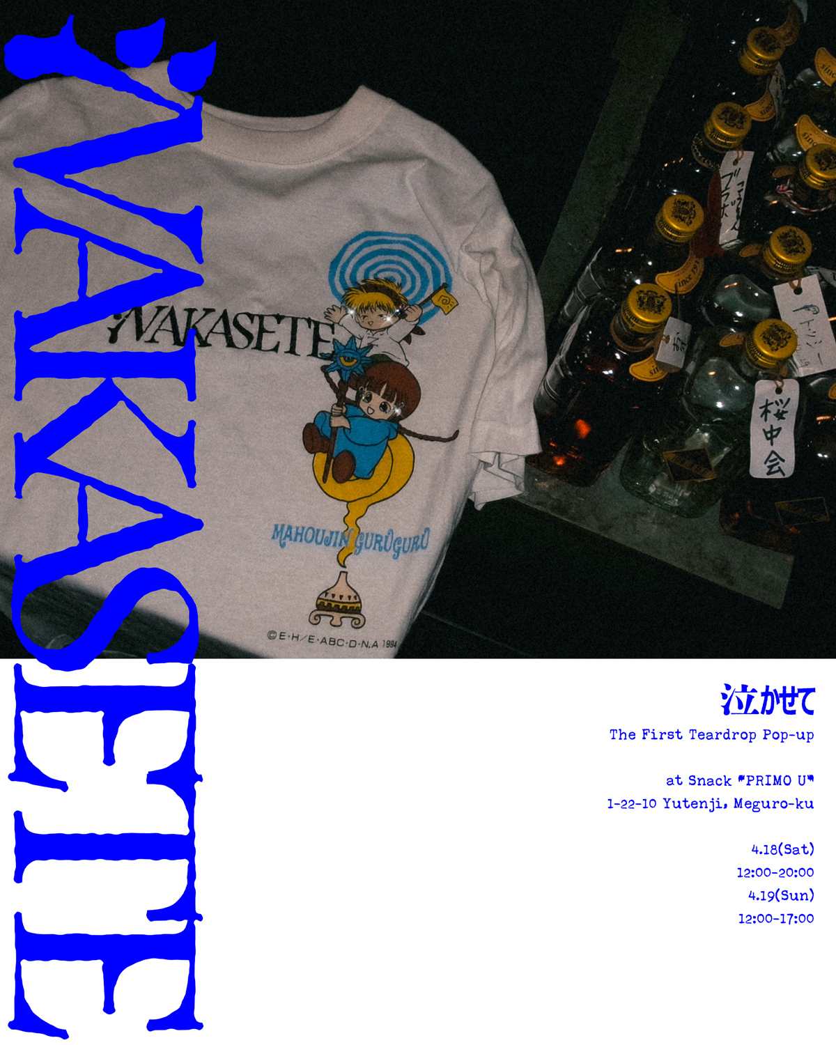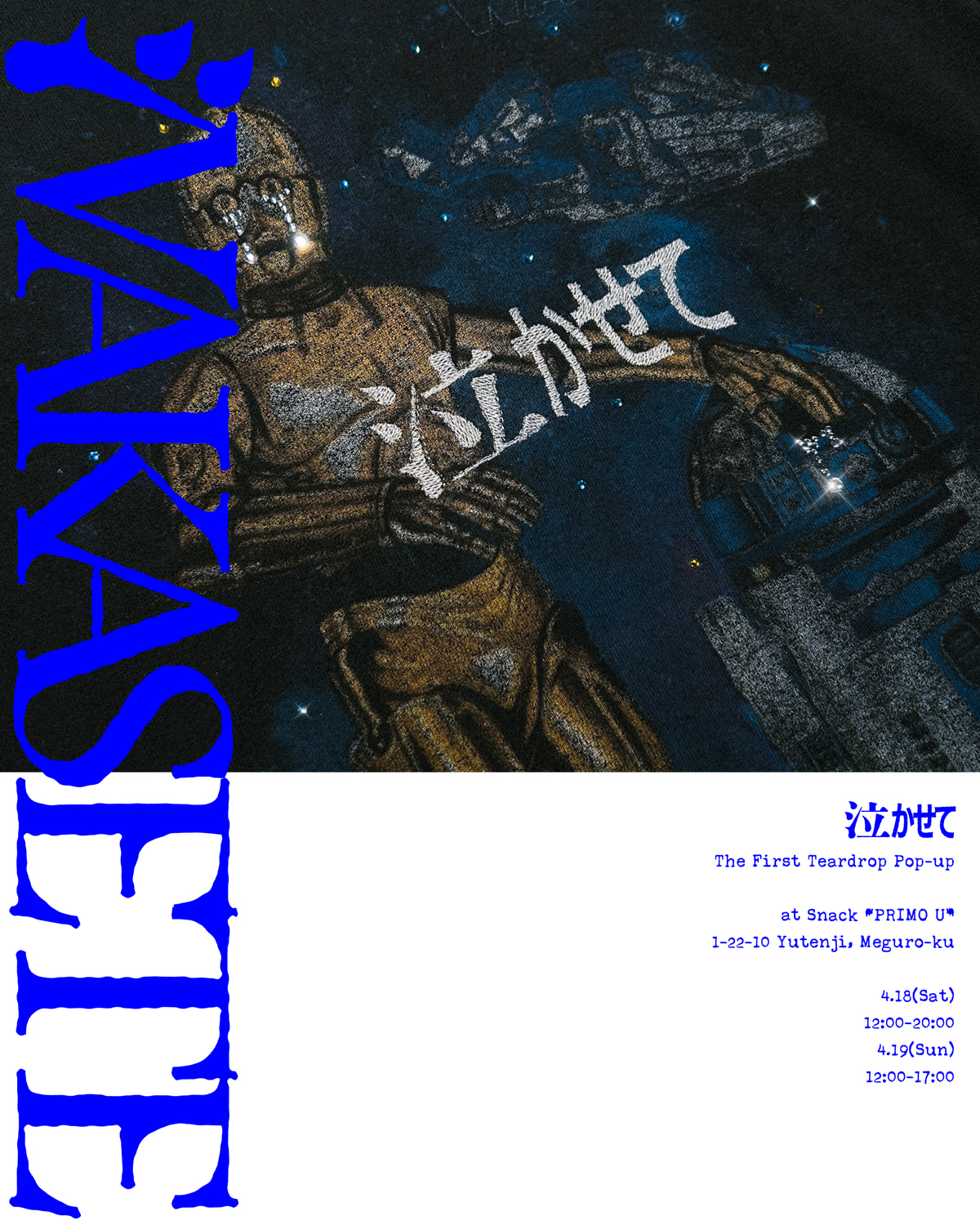 ヴィンテージTシャツにあしらわれたキャラクターや人物にラインストーンで“涙”の装飾を施すプロジェクト「NAKASETE(ナカセテ)」が、初の展示会を4月18日(土)、19日(日)の2日間に亘って東京・祐天寺 スナック プリモUにて開催。