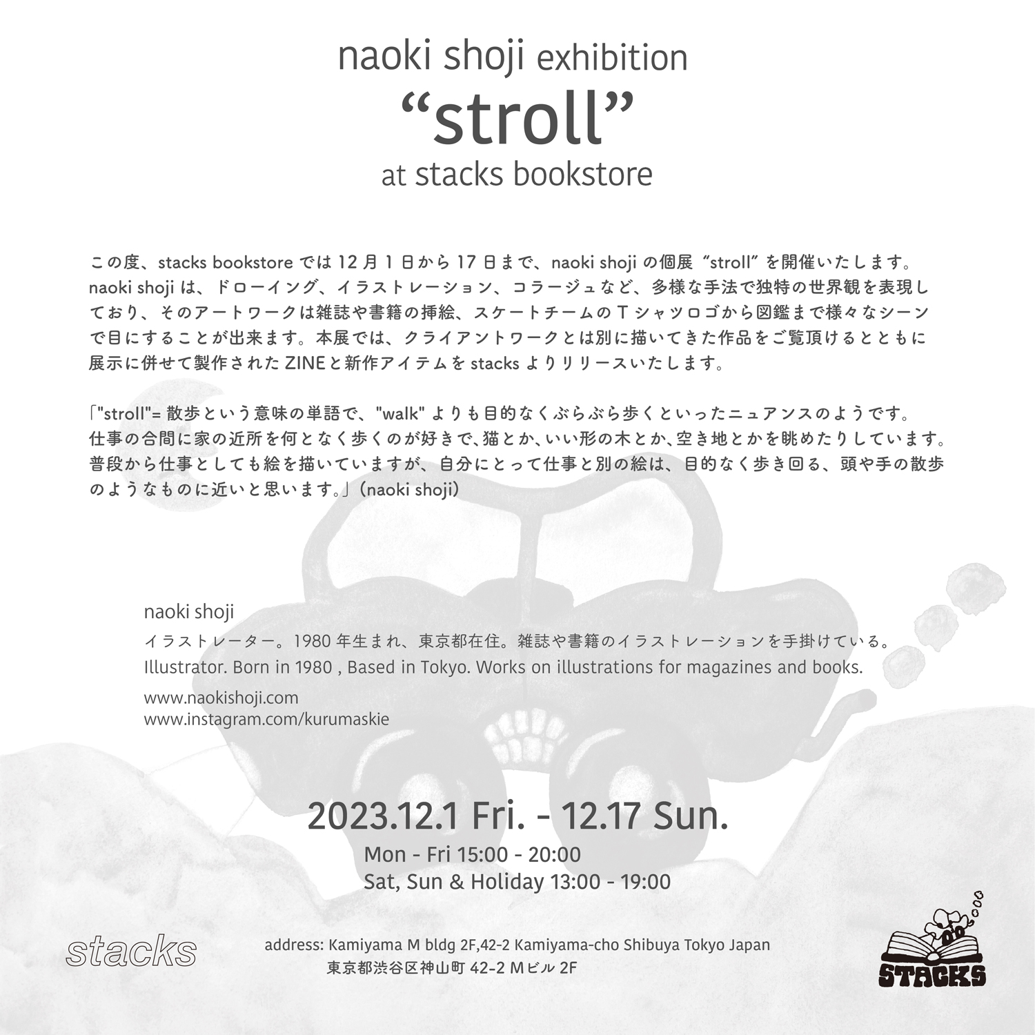 『BRUTUS』(マガジンハウス)、『POPEYE』(マガジンハウス)、『Music Magazine』(ミュージック・マガジン)、『TRANSIT』(講談社)、『山と溪谷』(山と溪谷社)といった商業誌の挿画や、EMC、環ROYらのカヴァー・アートなどで知られる画家・東海林巨樹(naoki shoji)が、12月1日(金)から17日(日)まで東京・渋谷の書店「stacks bookstore」にてソロ・エキシビション「stroll」を開催。