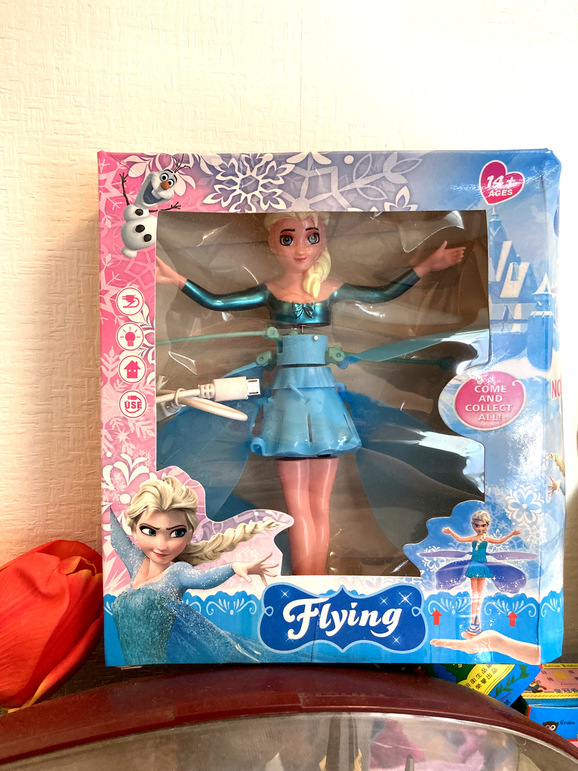 電源を入れるとウィーンという音と共にプロペラがすごい勢いで回り、プロペラで指を切るんじゃないかと思って怖かったですが、上に飛ばすとちゃんと飛んで、下に降りてきたら手をセンサーに近づけるとまた上に飛んで、めっちゃ楽しいおもちゃ!当然、床に落としましたが、1回でも2回でも3回でも壊れなかったです。天井が高いひろ~い部屋で遊びたい。◯ィズニー無許可だけど、みんな買ったほうがいいと思いました。