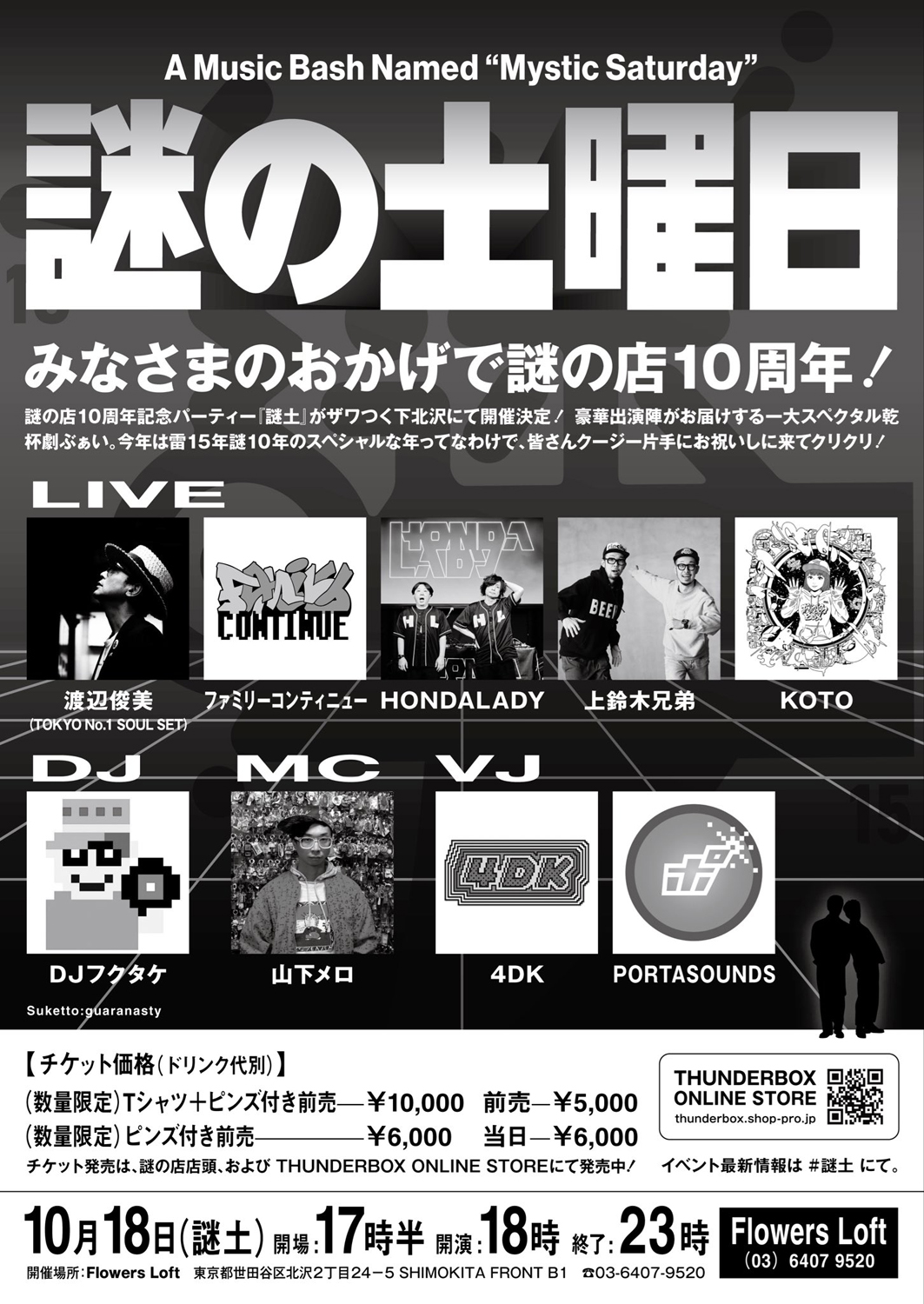 今年で創立15周年を迎えるデザイナー・森田ツヨシ主宰のアパレル・ブランド「THUNDERBOX」。東京・中野に構えるその旗艦店「謎の店」が、オープン10周年を記念したイベント「謎の土曜日」を10月18日(土)に東京・下北沢 Flowers Loftにて開催。