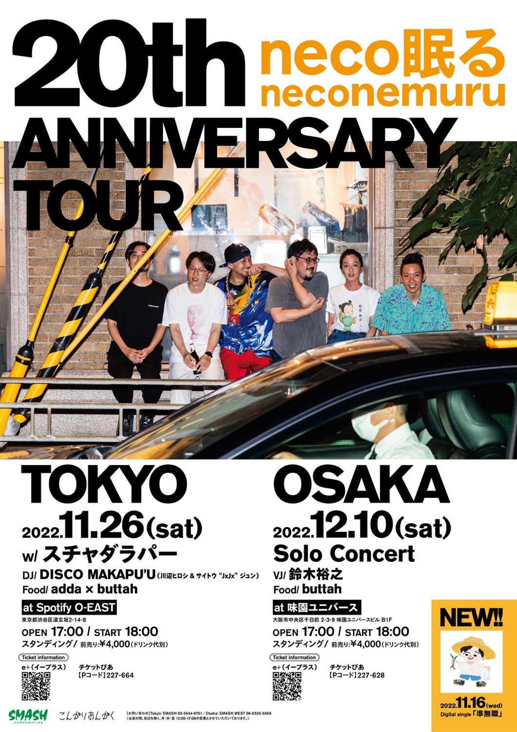 11月16日にシングル『準無職』をリリースしたneco眠る(BIOMAN + 伊藤コーポレーション(株) + 栗原ペダル + 三木章弘 + 森 雄大 + おじまさいり)が、結成20周年を記念した東阪ツアー「20th Anniversary TOUR」を11月26日(土)東京・渋谷 Spotify O-EAST、12月10日(土)大阪・千日前 ユニバースにて開催。