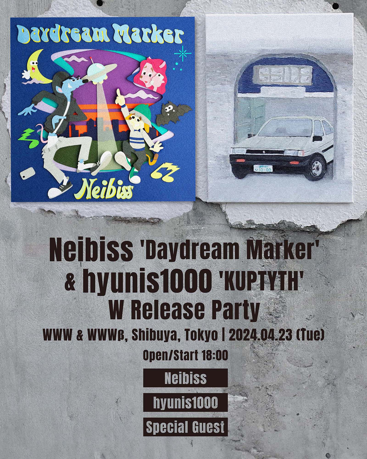 昨年11月に発売されたhyunis1000の2ndソロ・アルバム『KUPTYTH』(EPOCH)のリリース・パーティも兼ねて4月23日(火)に東京・渋谷 WWW / WWWβで開催される東京公演には、豪華ゲスト(TBA)が出演予定。大阪・東心斎橋 CONPASSにて5月6日(月)に開催される大阪公演は、Neibiss初の単独公演となっています。
