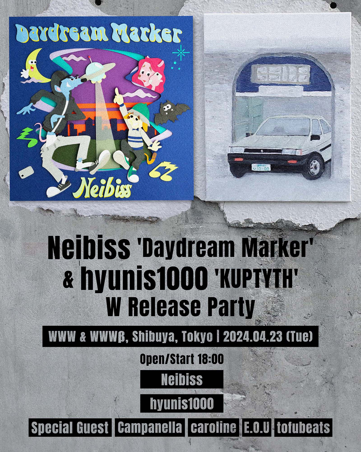 2月発表の目下最新フル・アルバム『Daydream Marker』が好評を博しているNeibiss(hyunis1000 + ratiff)が、同作とhyunis1000ソロ・アルバム『KUPTYTH』のダブル・リリース・パーティを4月23日(火)に渋谷 WWW + WWWβにて開催。同公演には、スペシャル・ゲストとしてCampanella、caroline、E.O.U、tofubeatsの出演が決定しています。