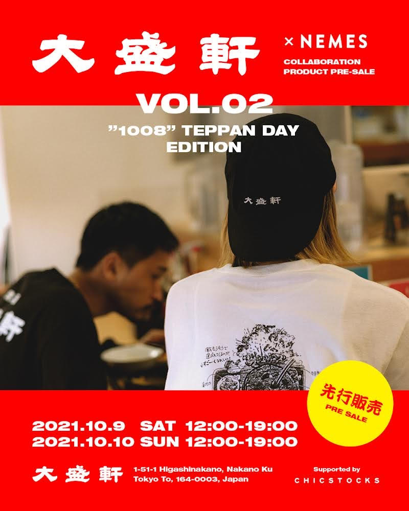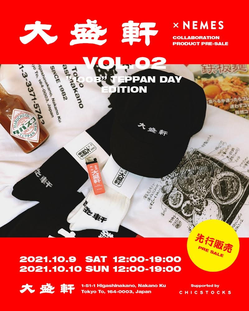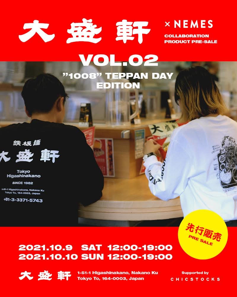 今年5月にコラボレート・アイテムを販売して即完売となった東京・東中野の老舗定食店「大盛軒(おおもりけん)」とZEN-LA-ROCK(FNCY)主宰ブランド「NEMES」が、コラボレーション第2弾を発売。10月9日(土)、10日(日)の2日間、前回同様に「大盛軒」野外スペースにてZEN-LA-ROCK直々の先行販売が実施されます。