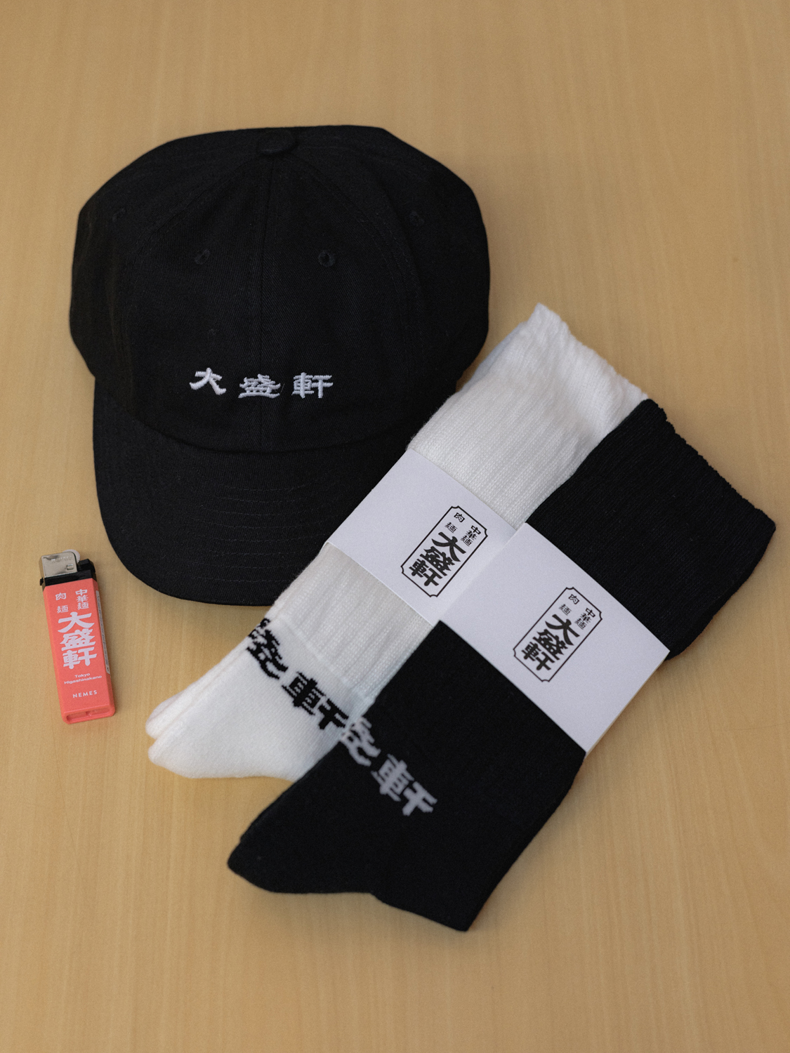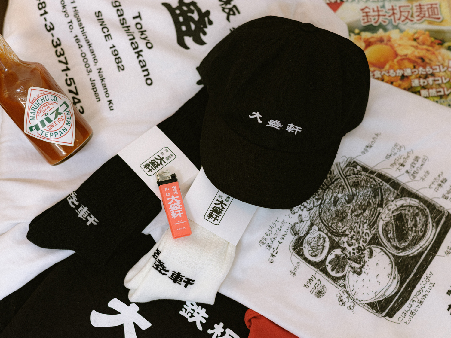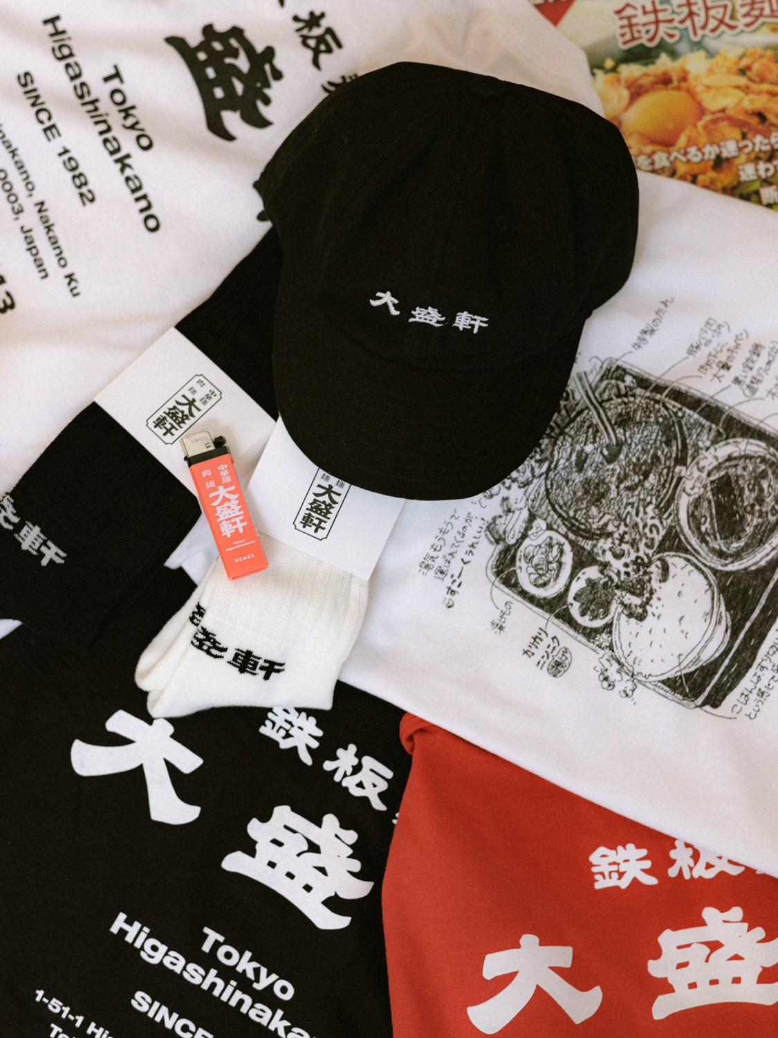 今回のコラボレーションは、10月8日を“テッパンの日”とし、同日の看板メニューとして「大盛軒」の『鉄板麺』を盛り上げるべく企画されたもの。第1弾で好評を博したTシャツのロング・スリーヴ(袖に「”1008″ TEPPAN DAY」の文字をプリント)に加え、新アイテムとして「大盛軒」のロゴをあしらった8パネル・キャップや、靴下ブランド「CHICSTOCKS」とコラボレートしたソックスもラインナップしています。先行販売では前回に引き続き、3,000円以上のアイテム購入者を対象に特製ステッカーを配布。「大盛軒」店内での『鉄板麺』オーダー時、同ステッカーの提示でトッピング『ソーセージ』2本無料のスペシャル・サービスが受けられます。なお、売上の一部は「大盛軒」への還元に充てられます。