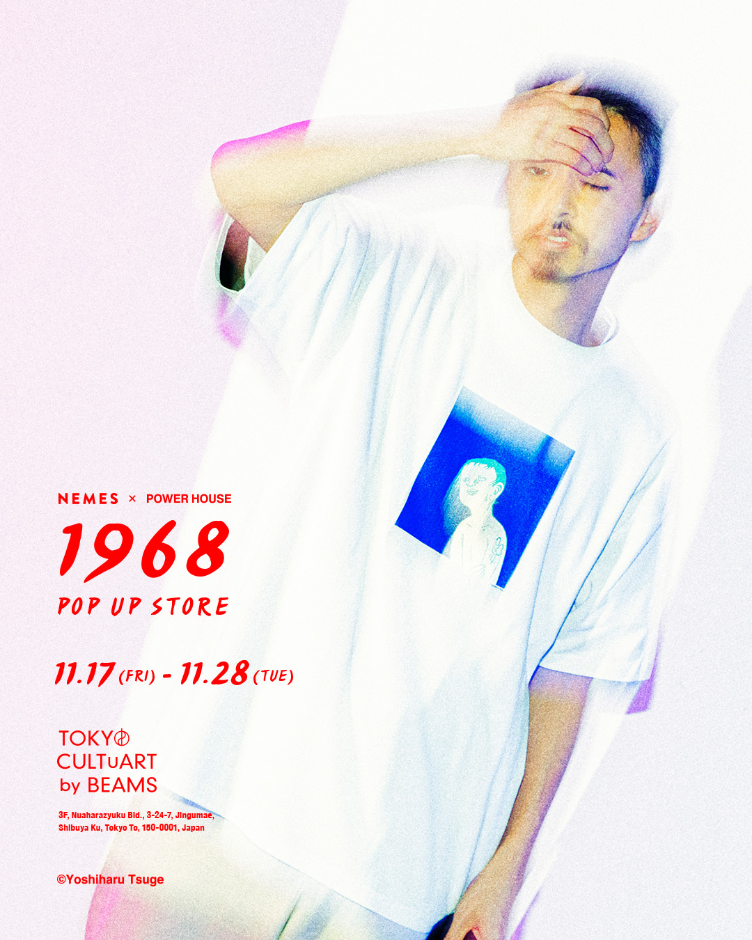 ZEN-LA-ROCK(FNCY)がディレクターを務めるファッション・ブランド「NEMES」と、つげ義春『つげ義春大全』(講談社 | 全23巻)のアートディレクションを手掛けたデザイン事務所「POWER HOUSE」(東京・原宿)がタッグを組み、つげの代表作のひとつ『ねじ式』(1968)にフォーカスしたカプセル・コレクション「NEMES x POWER HOUSE presents 1968」を発表。発売記念のポップアップ・ショップが11月17日(金)から28日(火)まで東京・新宿 TOKYO CULTUART by BEAMS(BEAMS JAPAN 4F)にて開催されます。