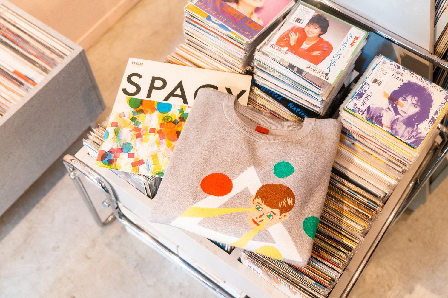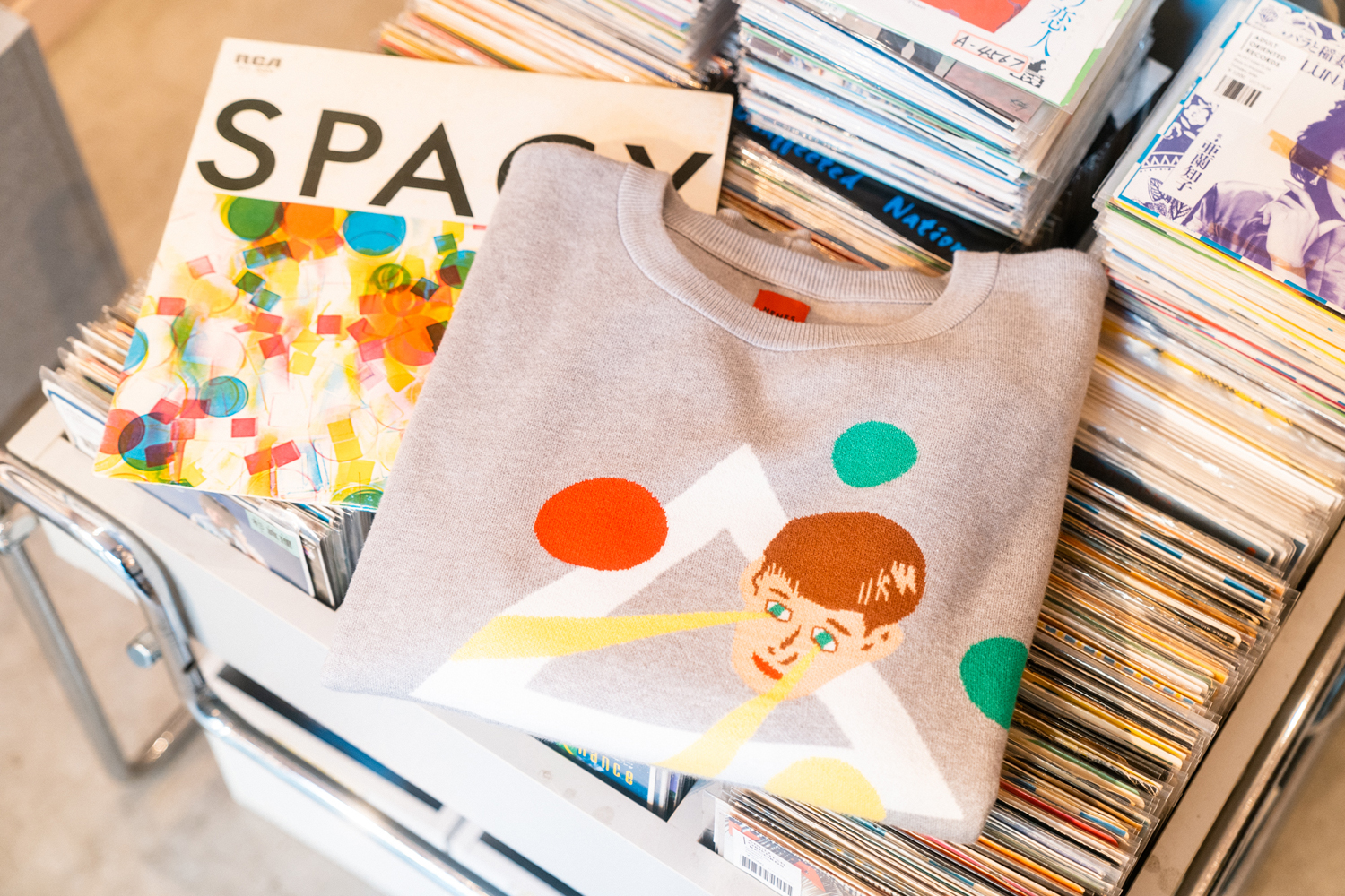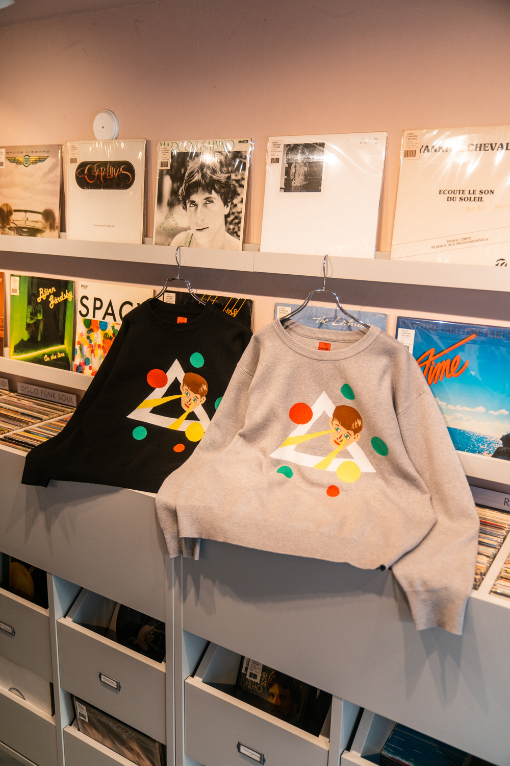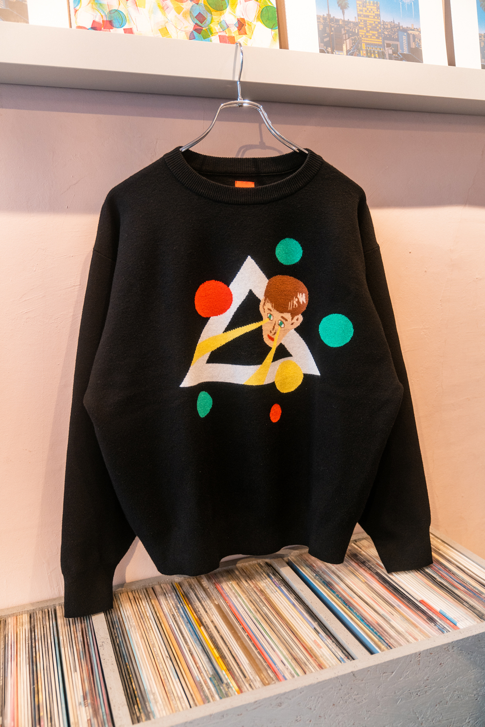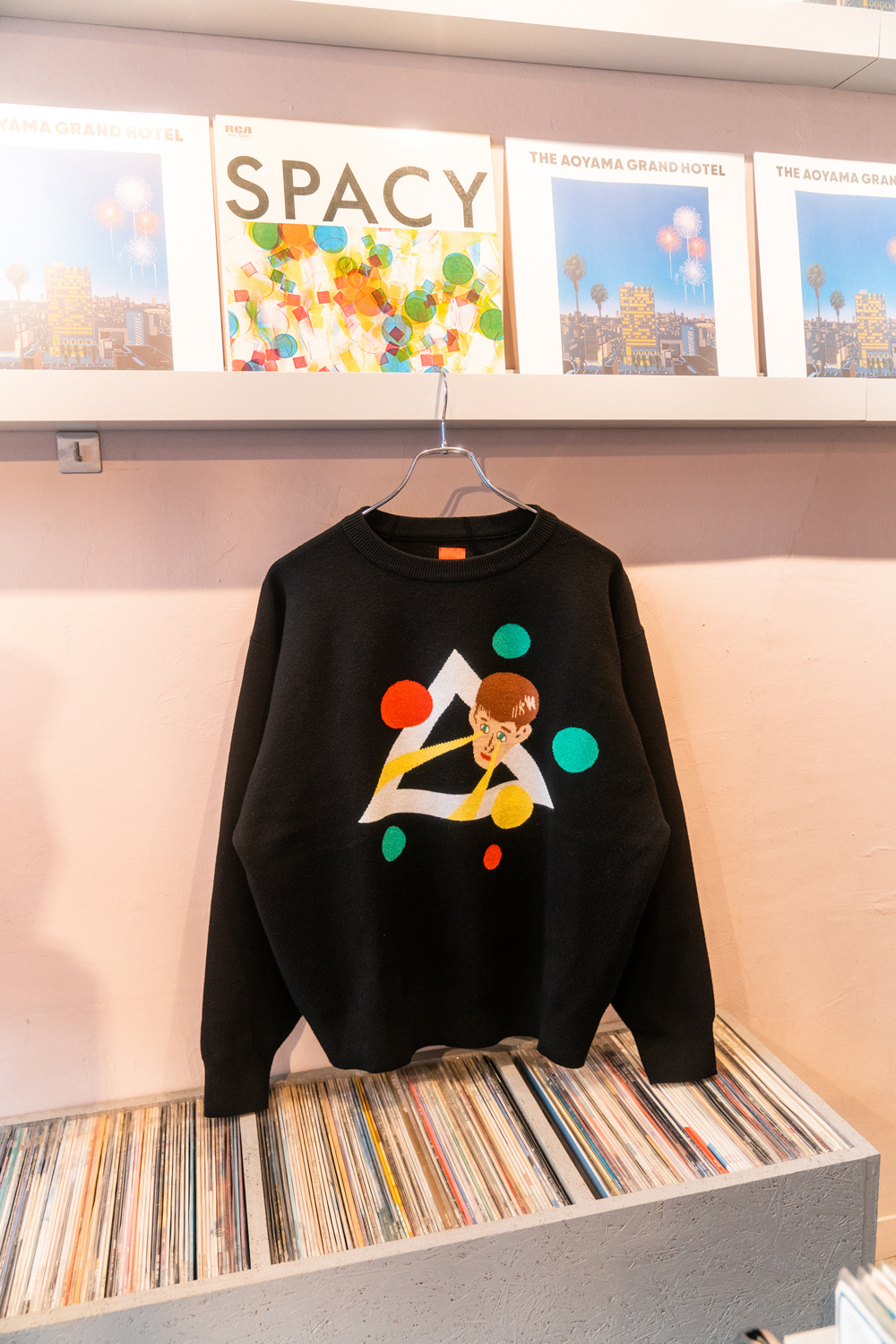 90sレガシー・スウェットからパターンを起こし、太いアームが特徴的なシェイプとなっている「NEMES "SPACY" KNIT」(NEMES 249 | 12,000円 + 税)は、ブラックとグレイの2色展開。某国内レジェンドが1970年代後半にリリースした名盤をモチーフにしたグラフィックがフィーチャーされています。