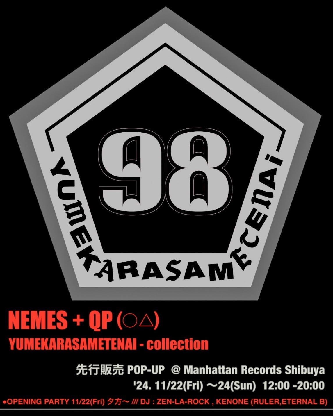 今年は浅野忠信とコラボレートしたコレクション「OTOMODACHI」が話題となったZEN-LA-ROCKディレクションのブランド「NEMES」と、東京・中野「FATBROS」にて継続中の企画「P展」が好評を博しているグラフィティライター・QPが、カプセル・コレクション「98」を発表。