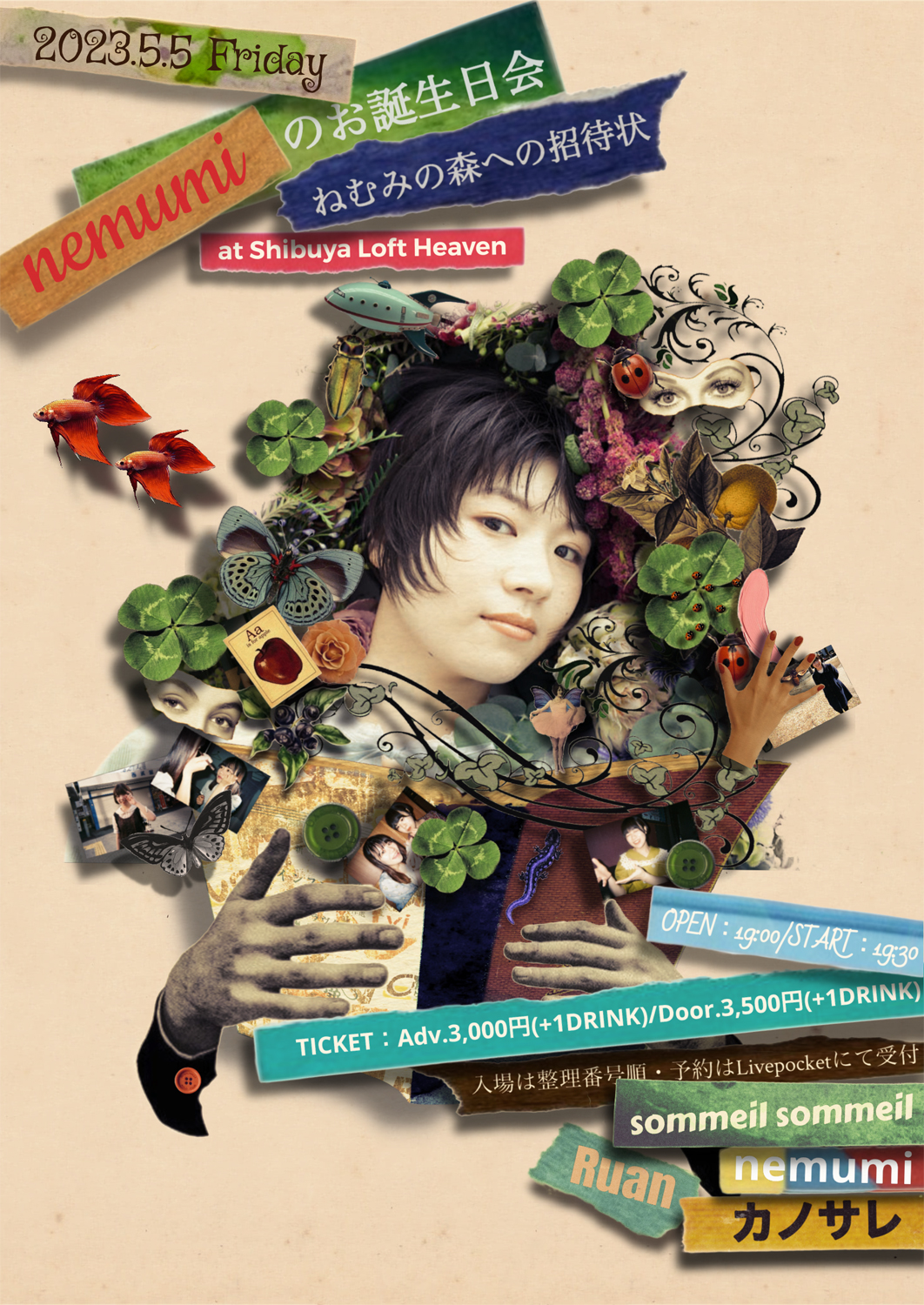 結成5年目にして初フル・アルバム『Bon voyage!』のリリース、ファウンディング・メンバーであった夏芽すやりの卒業など、起伏に富んだ1年となった2022年を経てデュオ体制で活動中のsommeil sommeil(nemumi + 夢乃なこ)が、5月5日(金・祝)にメンバー・nemumiの誕生日パーティ・ライヴ「nemumiのお誕生日会~ねむみの森への招待状~」を東京・渋谷 LOFT HEAVENにて開催。当日に先駆けて公開されているフライヤー・アートは、長田左右吉(電影と少年CQ運営)が手がけています。