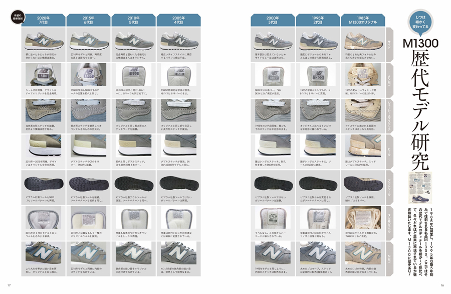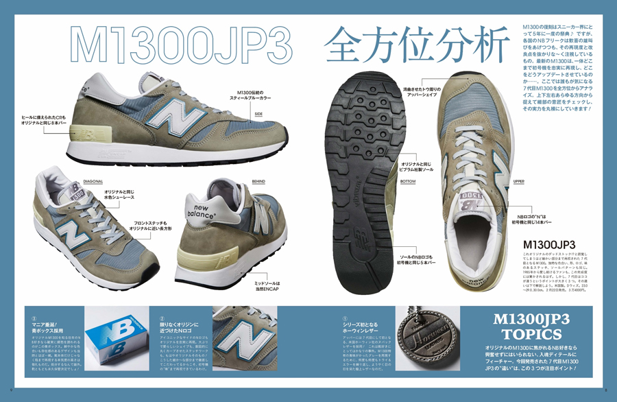 『M1300』の7代目となる『M1300JP3』は、2015年以来5年ぶりの復刻。独占的にその生産工場への取材を許可され、米ボストンの本社へ赴いて制作したという本誌には、「M1300」の全パーツや全生産工程、歴代モデルの比較ほか、過去から現在までの「New Balance」を代表する品番を体系的にまとめたカタログなども掲載されています。