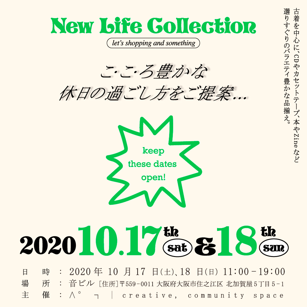 大阪の多角的コレクティヴ「creative, community space ∧°┐」が運営するニュース・メディア / オンライン・ストア「New Life Collection」が、同名のショッピング・イベントを10月17日(土)、18日(日)の2日に亘って大阪・北加賀屋 音ビル 2Fにて開催。