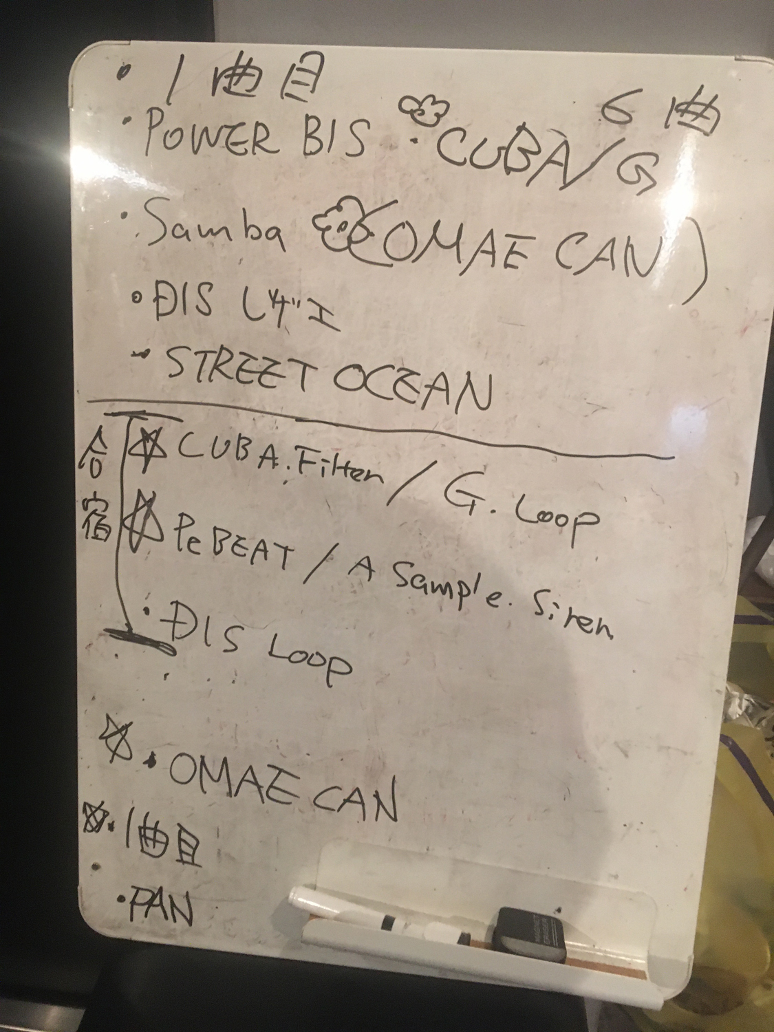 A 「そのときは1曲も完成までいかなかった。“サンバ”と“キューバ”っていう、仮タイトルの状態のループ素材が残ったくらい。全員でそれを聴いて“いろいろやったけど、普通にこれサンバやな~”ってゲラゲラ笑ってた。“キューバ”はなんかキューバのギター音楽をサンプリングして単純にループしてるだけとかやったかな」