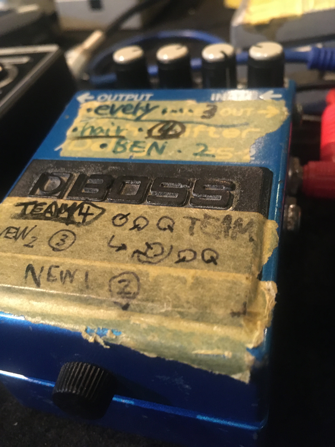 K 「(宅録で作った曲のアイディア・スケッチが)ある程度固まったら、それを基にスタジオに入って演ってみるんやけど、当然多重録音の波形編集で作られている曲なので、人力で完璧な再現はできない。でも、どうにかしてやる上で無理をしたり、ごまかしたりすることになって、それで実質、即興性が出てくるわけなんやけど。そこをしっかり聴き分けて、想定していなかった動きとか響きの良かった部分を記憶しておいて、意図的に繰り返す。具体的にどういうことかというと、いい音が出たときのエフェクターのツマミの位置とか、押し間違えたりズレたりしておもしろかったら、それを曲として正しいと捉えて今後はそうやっていくとか」