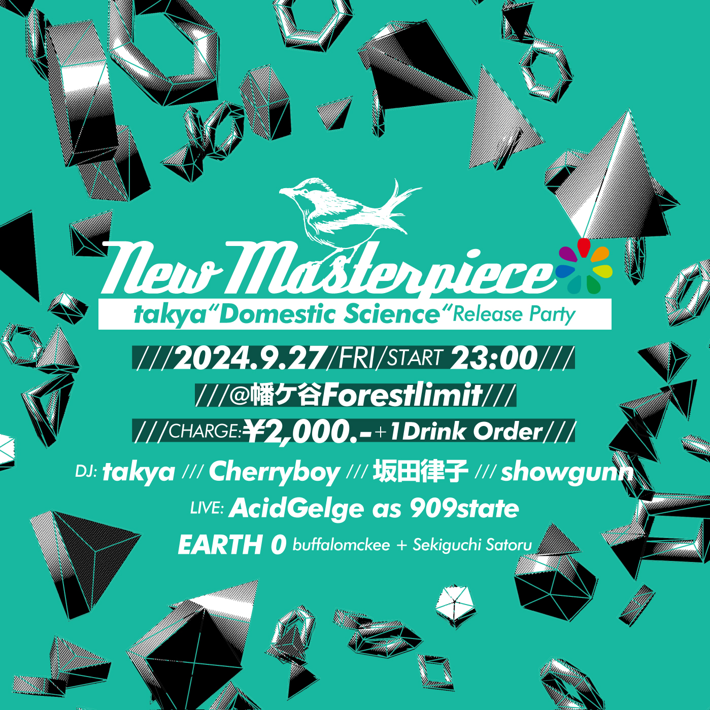 同公演は、7月に「New Masterpiece」より発売されたtakya(fka takuya)最新作『Domestic Science』のリリース・パーティとして開催されるもの。takyaに加えてCherryboy(Function)、坂田律子(fuelphonic, pagtas)、showgunn(MOUSOU PAGER)がDJを務め、AcidGelge as 909state、EARTH 0(buffalomckee + セキグチサトル)によるライヴ・パフォーマンスも予定されています。