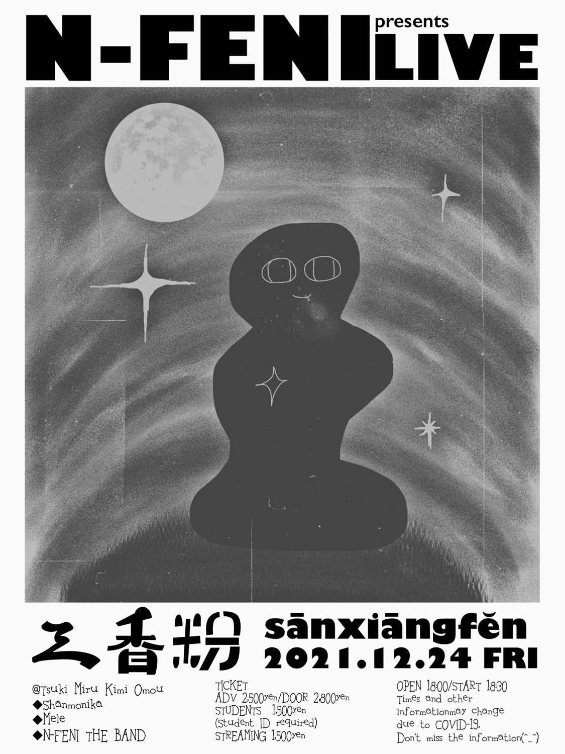 同公演は、“四季連続リリース”のシングル・クアドリロジー「Four Seasons」が好評を博しているメレ(中村伊織 + 白石はるか)、4月に1stフル・アルバム『トゲトゲぽっぷ』を発表したシャンモニカとの3マン・ライヴ。ん・フェニは、リーダー・バンド“N-FENI THE BAND”を率いたバンドセットでのパフォーマンスが予定されています。