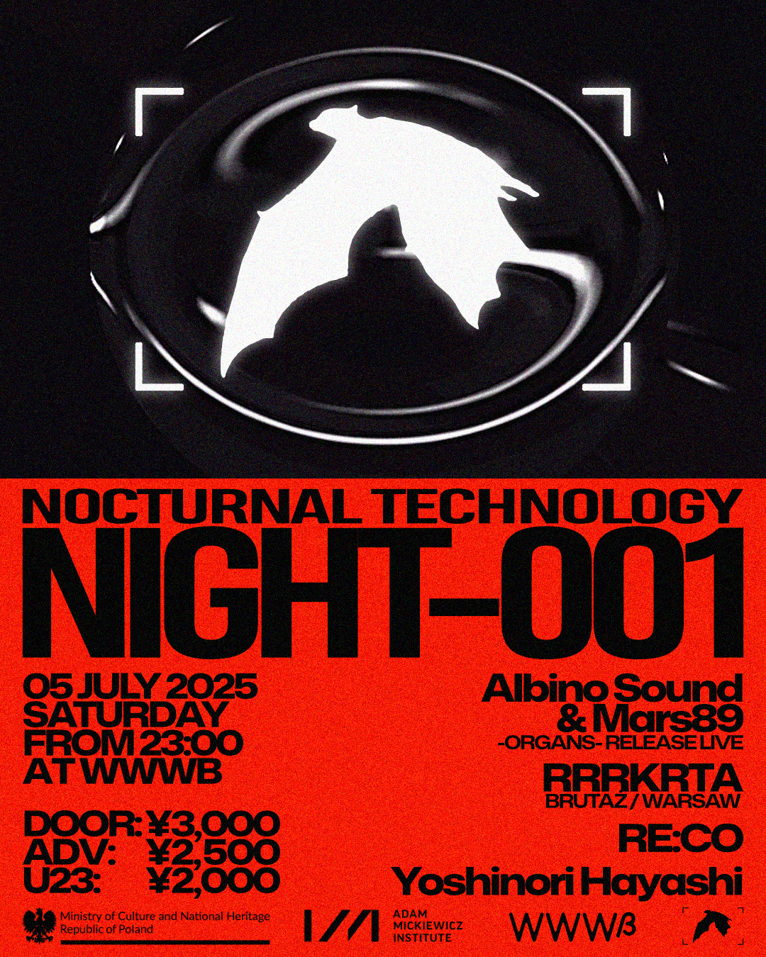 暗所でのエコーロケーションをモチーフにしているというコウモリのロゴでおなじみ、Mars89主宰レーベル「Nocturnal Technology」が、2024年の設立から1周年。これを記念した初のレーベル主催イベント「NIGHT-001」が、7月5日(土)に東京・渋谷 WWWβにて開催されます。