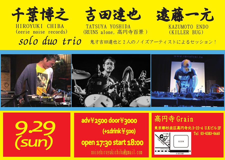 近年もソロ・フォーム“RUINS alone”としてのみならず、高円寺百景、是巨人、PHAIDIA、RUINS、Vampilliaなどの一員として精力的に活動中の吉田達也と、レジェンダリーな“Killer Bug”名義で知られ、1990年代より活動を続ける遠藤一元、宮城・仙台を拠点にレーベル / ディストロ「eerie noise records」のオーナーとしても活躍する千葉博之の3者が、9月29日(日)に東京・高円寺 Grainにてライヴ・セッション「吉田達也 遠藤一元 千葉博之 Noise Session」を開催。