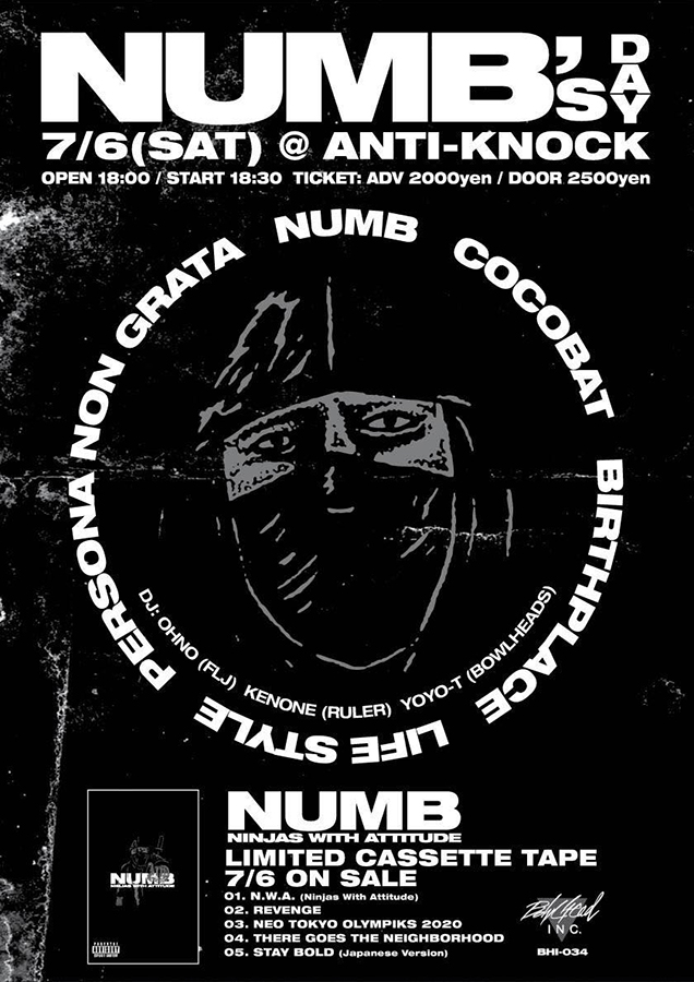 今年2月にKen-One(ETERNAL B / RULER)が主宰レーベル「All Ages Hardcore」より最新EP『Ninjas With Attitude』を7″ヴァイナル・フォーマットで発表した東京ハードコア代表・NUMBが、7月6日(土)“ナムの日”に毎年恒例のライヴ・イベント「NUMB’S DAY」を根城である東京・新宿 ANTIKNOCKにて開催。NUMB、COCOBAT、BIRTHPLACEの東京勢に加え、鹿児島からLIFE STYLE、神奈川・横浜からPERSONA NON GRATAの出演が決定しています。