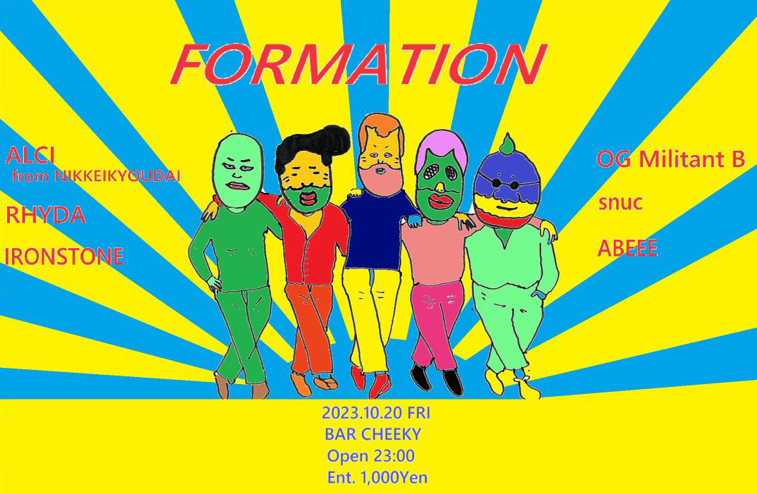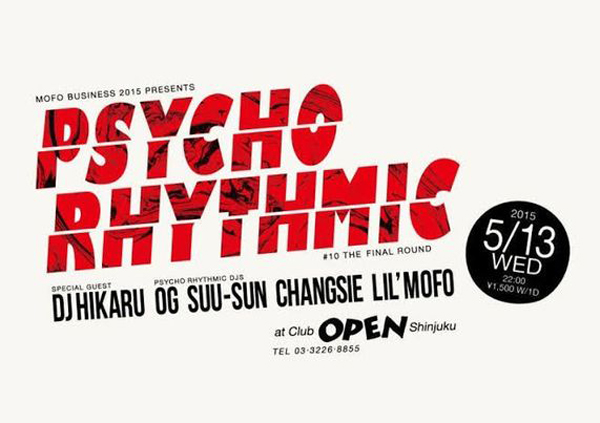 「その頃に、RHYDAと吉祥寺のbar Cheekyで“FORMATION”っていうレギュラー・パーティを始めた。このパーティはマサ君(DJ Conomark)がやっていた“FOUNDATION”っていうパーティの枠が前身で、俺らが引き継いでやってた。もうひとつがLIL MOFO、Changsie、SUU-SUNとの4人でやっていた“PSYCHO RHYTHMIC”っていうパーティ。新宿のclub OPENでやる前、LIL MOFOが歌舞伎町のGaramで毎週か隔週でレギュラー・パーティをやっていたんだけど、そこに俺がゲストで出たことがあって。Changsieも同じパーティにゲストで出てたし、みんなとはほとんど同時期に知り合ったかな。PSYCHO RHYTHMICに対しては4人とも同じような気持ちでやってそうだなって集まったからパーティは2年くらい続いて、九州ツアーをやったり、ラストはDJ HIKARUさんを呼んだりしてた」