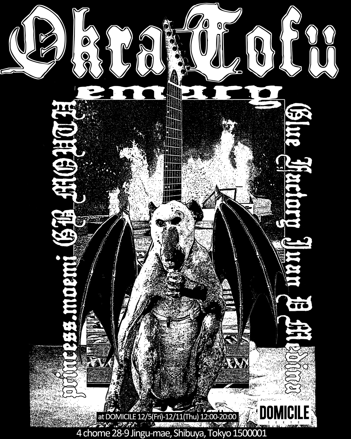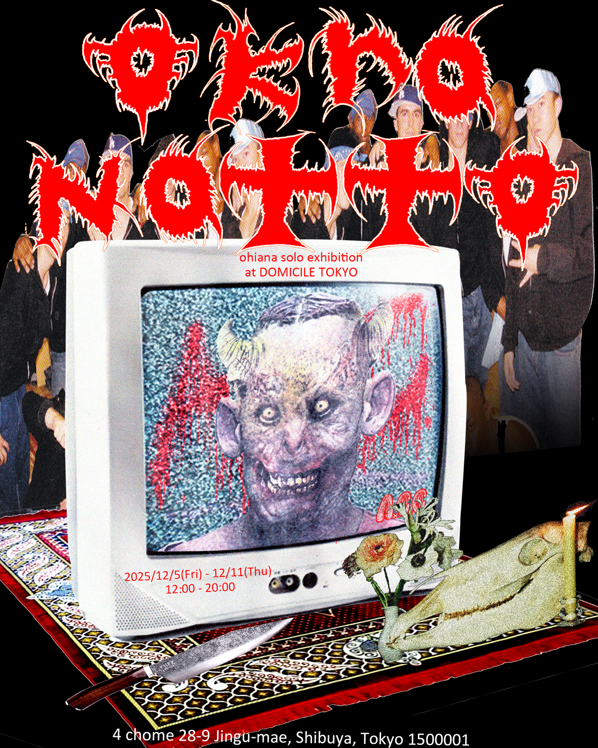 2022年に大阪・谷町 POLにて開催した「Burn to shine」以来約3年ぶり、DOMICILE TOKYOでは初個展「Lucha solitaria」以来約4年ぶりの個展となる「Okura Natto」では、コラージュを中心に布、A2サイズの平面、大型作品などを展示。初日に実施されるオープニング・レセプションでは、島田辰哉 aka SIMAXOXによるライヴ・パフォーマンス、NIGELTHREETIMES、BIG-K(DMB PRODUCTION)のDJが予定されています。