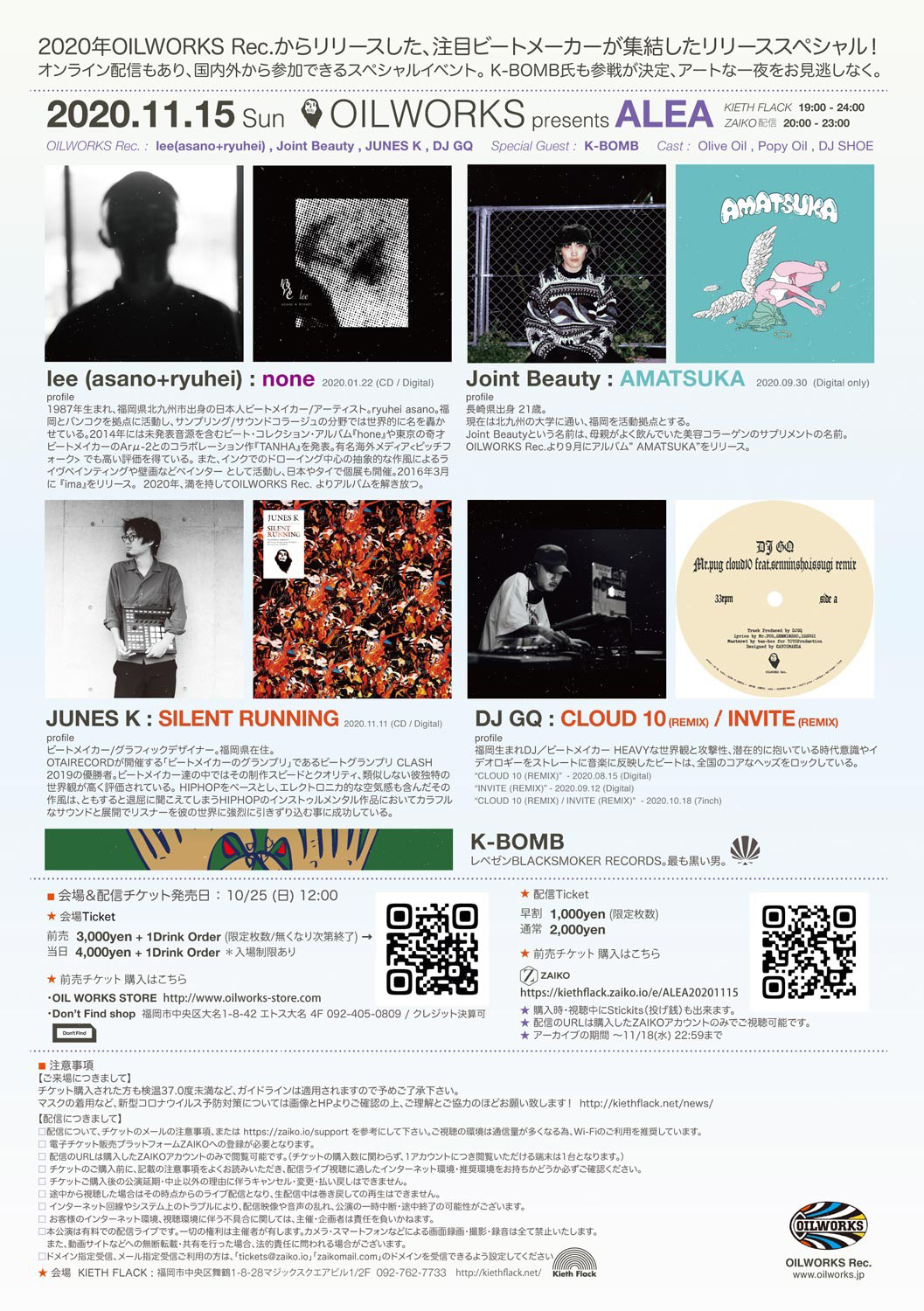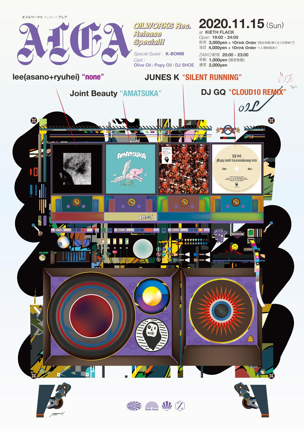 福岡のアート・コレクティヴ / レーベル「OILWORKS」が、不定期に主催するパーティ「ALEA」のスペシャル・エディション「OILWORKS presents ALEA OILWORKS Rec. Release Special!」を11月15日(日)に福岡・天神 Kieth Flackにて開催。当日はZAIKOでのライヴ配信も実施されます。