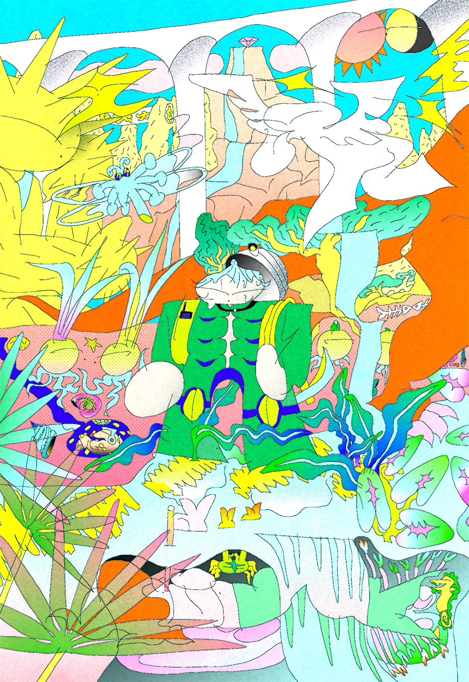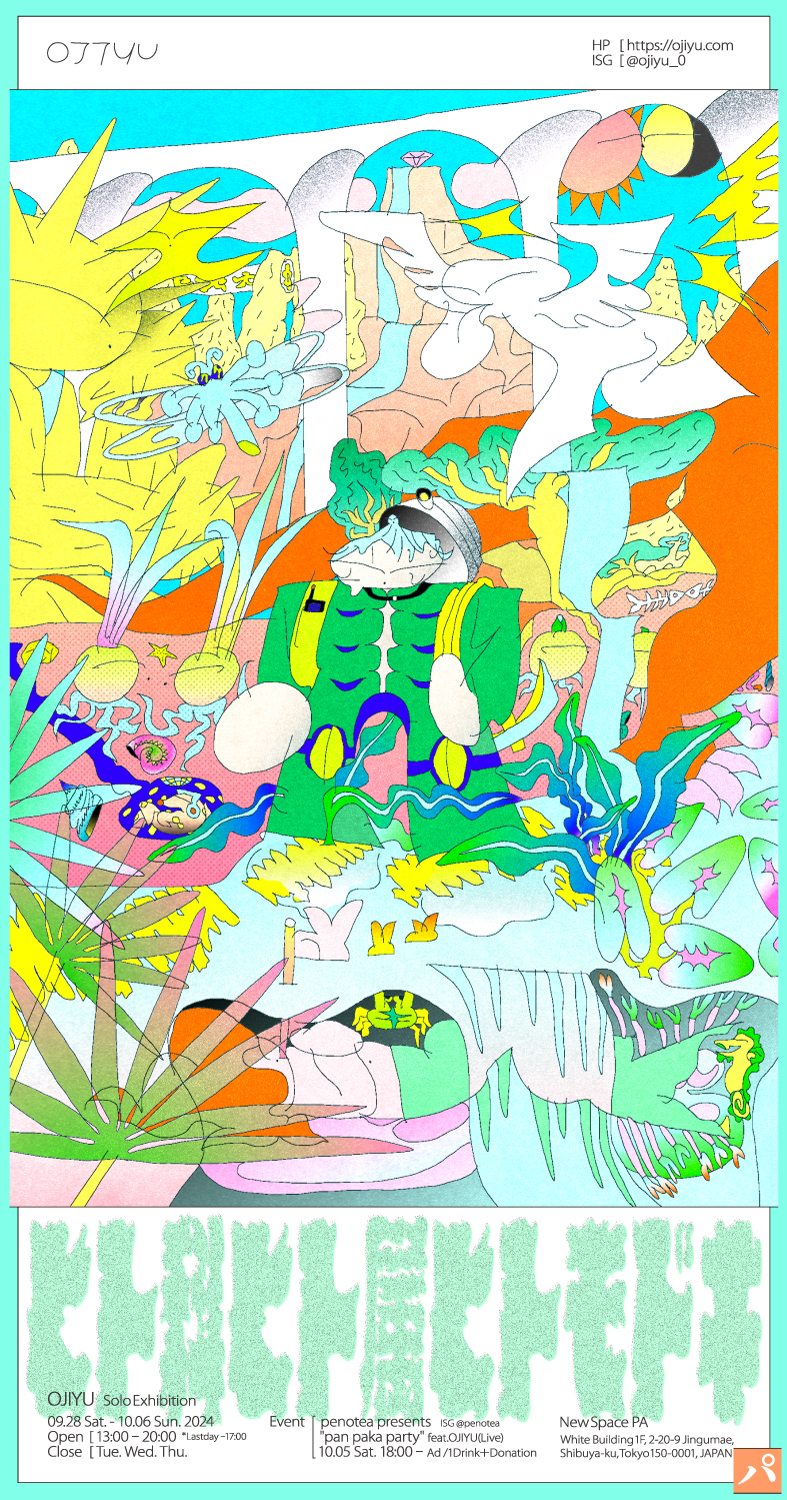 を制作し続けるOJIYU。「ヒト科ヒト属ヒトモドキ」では大判の平面作品を中心に出展。新作マーチャンダイズの販売も予定されています。会期中の10月5日(土)には、「pan paka party feat. OJIYU」と題した音楽家 / 発明家・ペのてあによるライヴ・イベントを会場内で開催(予約不要 / 1ドリンクオーダー + 投げ銭)。