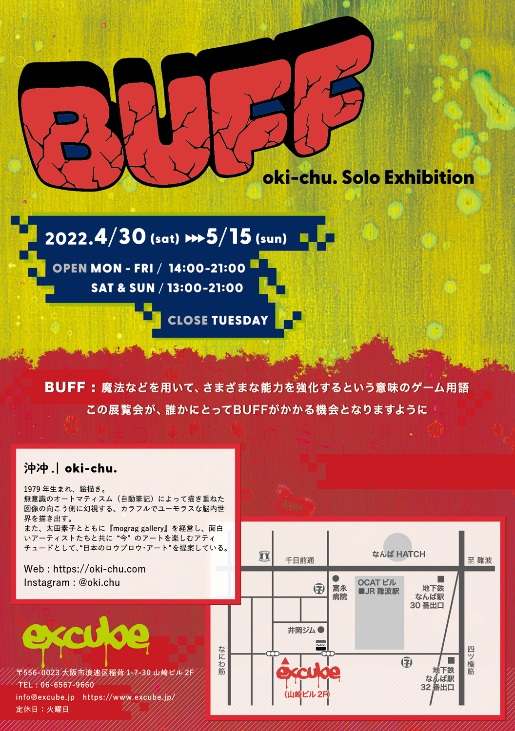 昨年10月に個展「THINKING MONKEY」を東京・新宿 新宿眼科画廊で開催した沖冲.(oki-chu.)が、 7ヶ月ぶりのソロ・エキシビション「BUFF」を4月30日(土)から5月15日(日)まで大阪・難波 excubeで開催。
