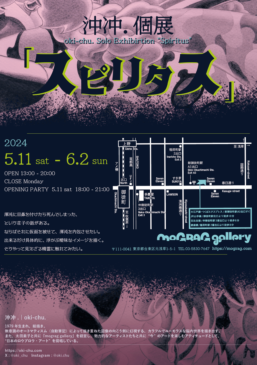 昨年は初の漫画作品『ニューロンズ』(mograg Publication)を刊行し、記念エキシビションも好評を博した沖冲.が、東京では3年ぶりとなる絵画展「スピリタス」を東京・新御徒町 mograg galleryにて5月11日(土)から6月2日(日)まで開催。