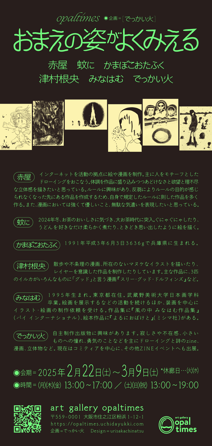 大阪・粉浜のギャラリー「art gallery opaltimes」が、赤屋、でっかい火、かまぼこおたふく、蚊に、みなはむ、津村根央の作家6名が出展するグループ・エキシビション「おまえの姿がよくみえる」を2月22日(土)から3月9日(日)まで開催。