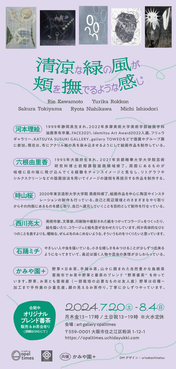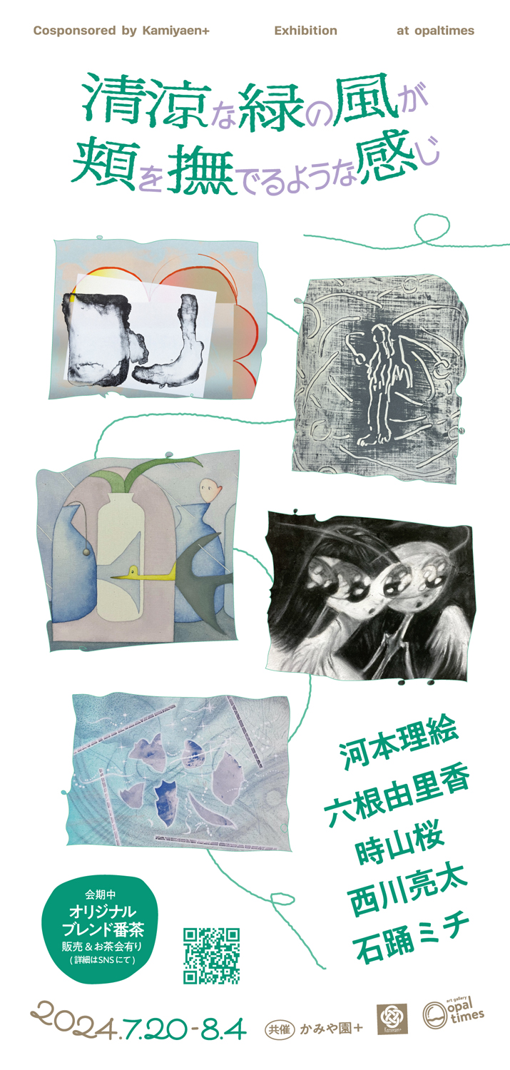 大阪・粉浜のギャラリー「art gallery opaltimes」が、石踊ミチ、河本理絵、西川亮太、六根由里香、時山 桜の5名が出展するグループ展「清涼な緑の風が頬を撫でるような感じ」を7月20日(土)から8月4日(日)まで開催。フライヤー・デザインはurisakachinatsuが担当しています。