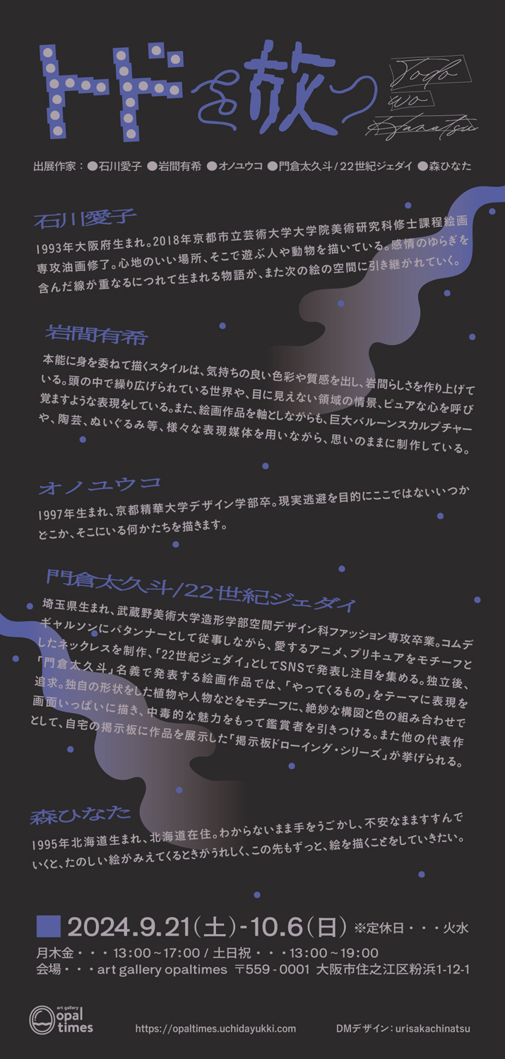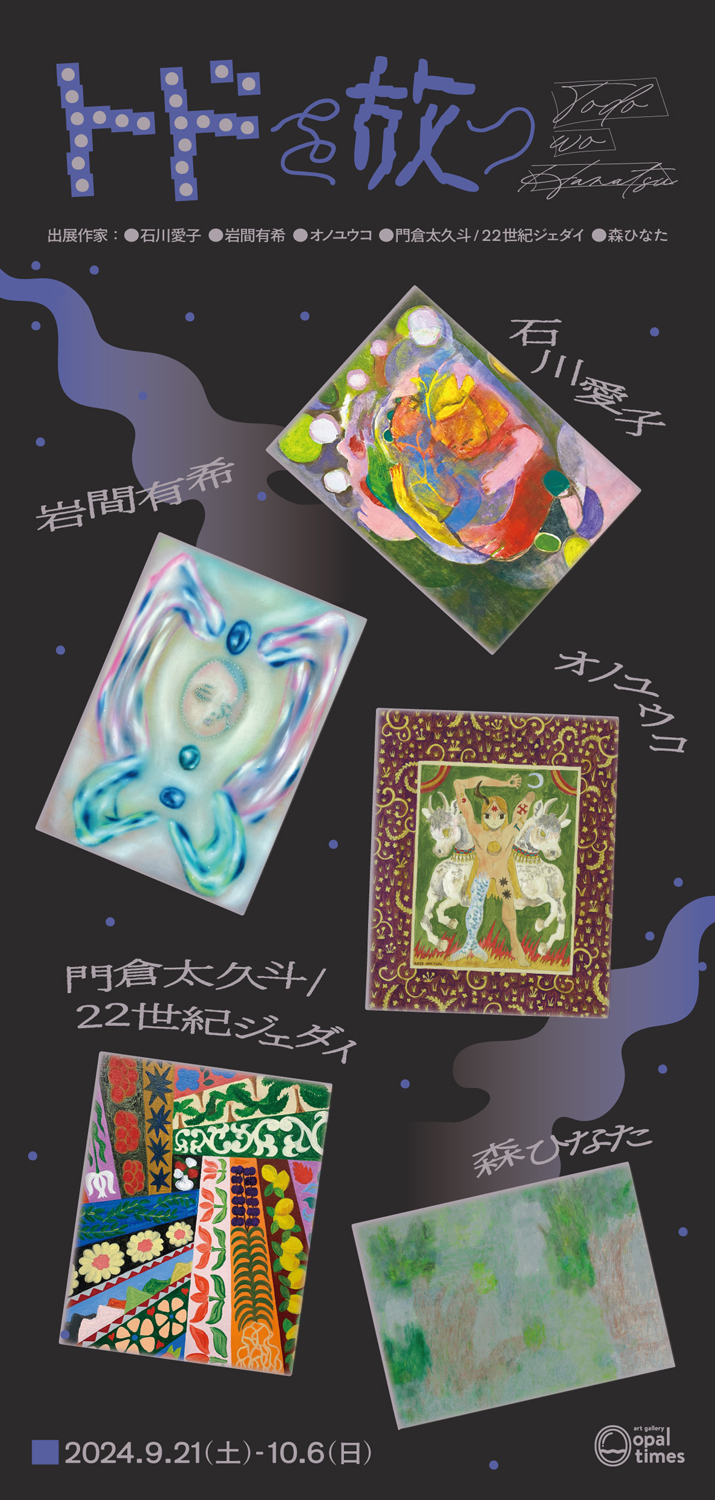 大阪・粉浜のギャラリー「art gallery opaltimes」が、石川愛子、岩間有希、門倉太久斗 aka 22世紀ジェダイ、森ひなた、オノユウコの作家5名が出展するグループ展「トドを放つ」を9月21日(土)から10月6日(日)まで開催。