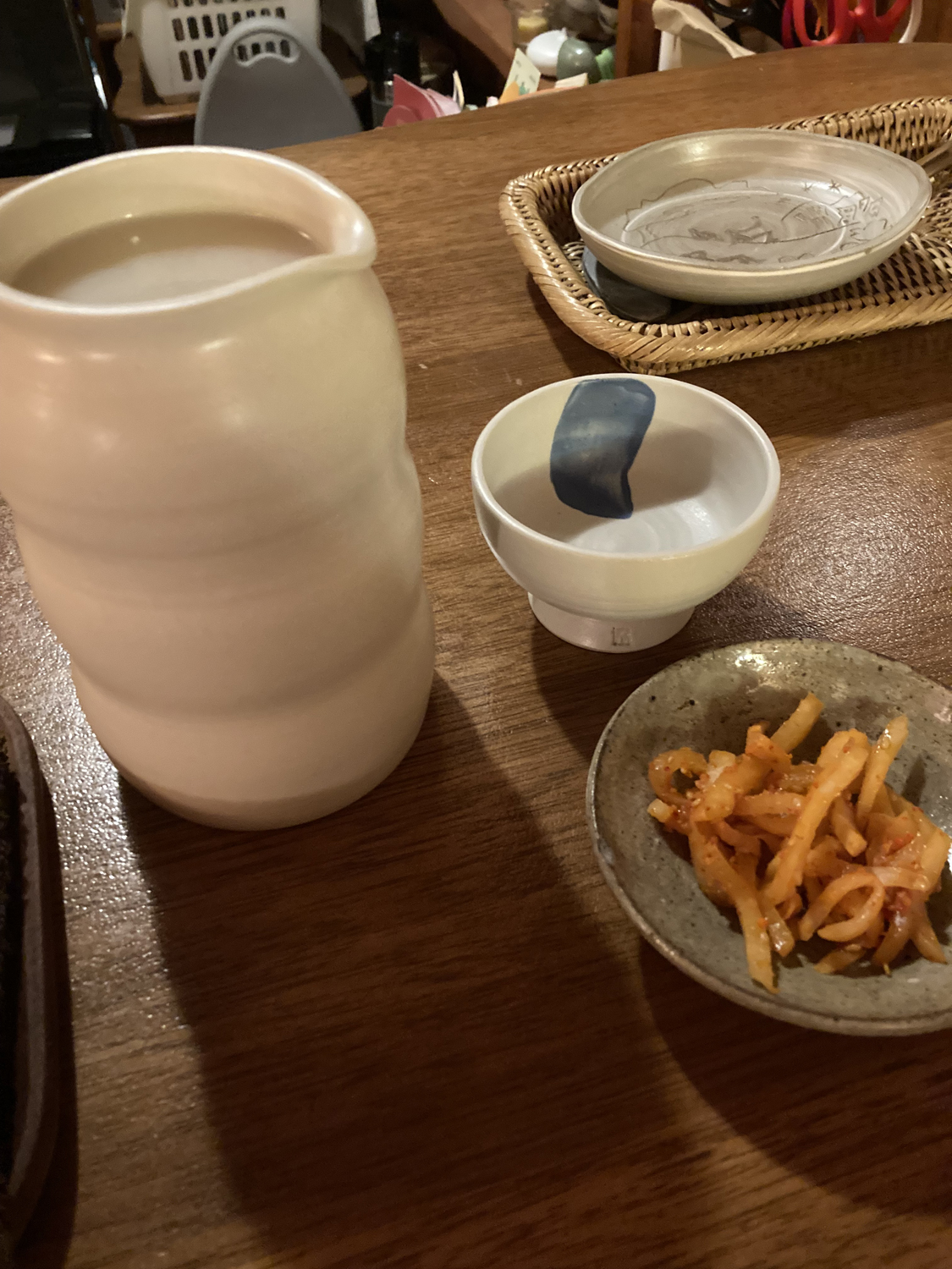 ここで食べたかったのは、ごま油で和えたまぜそば。Google翻訳で青唐辛子、サンチュ、椎茸を和えていますと説明された。香ばしくてスルスルと食べられるし、つまみにもなりそう。というわけで、自家製マッコリをボトルで頼む。これが実にうまい。ほとんどアルコールを感じないので、カルピスを飲んでいるような気分になるのだが、だんだんほろ酔いになってくる。付け合わせで出てきた米麹に漬けたという大根キムチもつまみながら、ひとりで500ml全部飲んでしまった。店主は空間デザイナーでもあるそうで、おしゃれ過ぎない、ちょうどいい感覚のあるインテリアがたくさん。