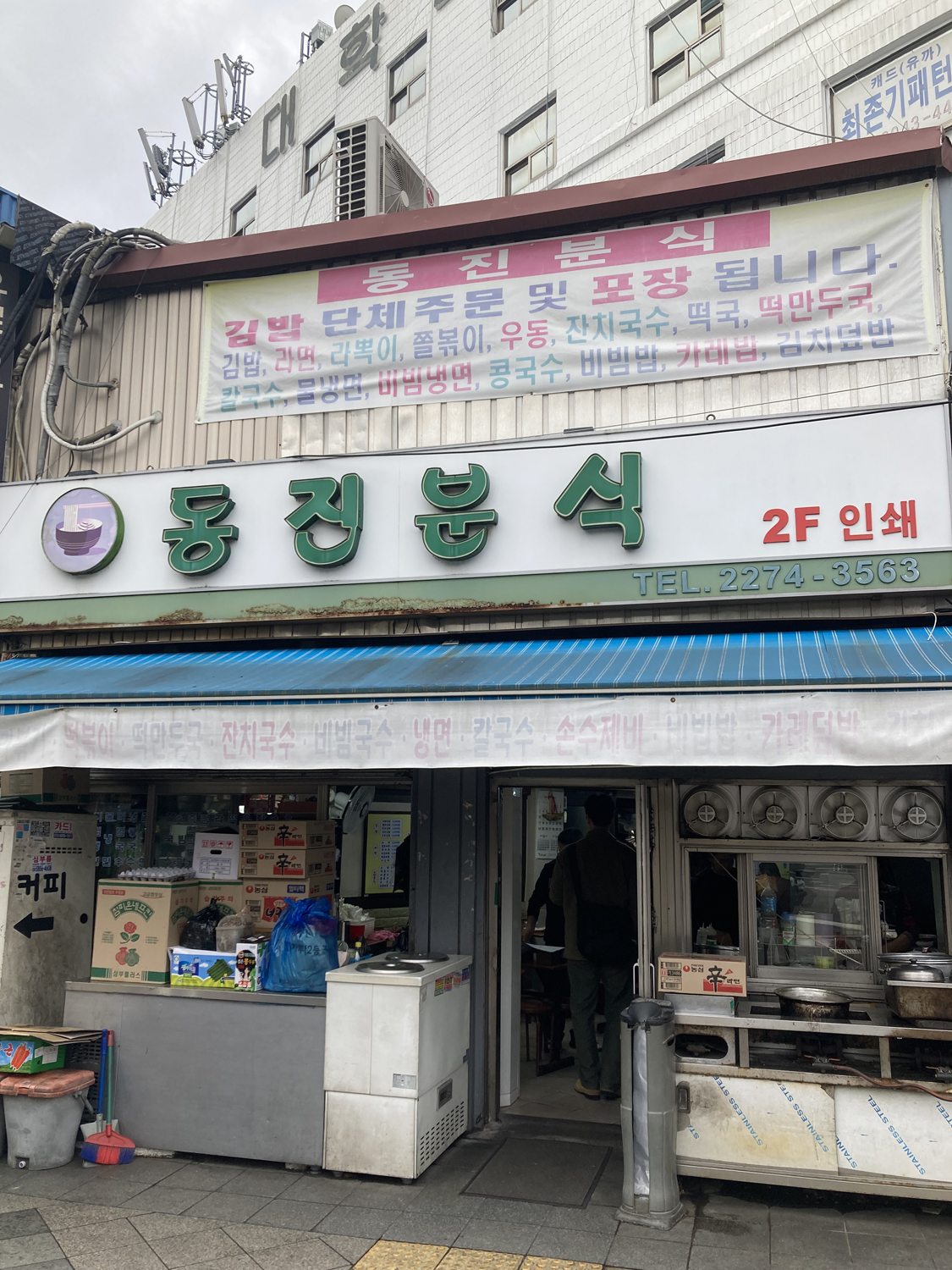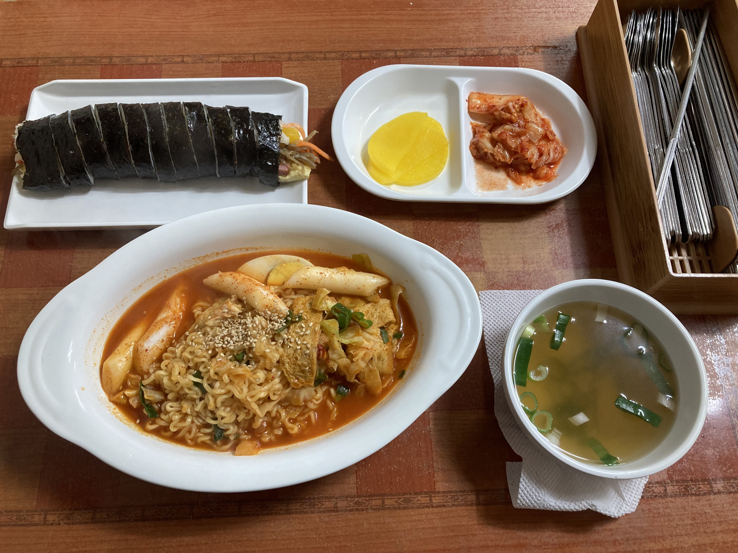 まずは焼き魚定食を出す店が並ぶ「焼き魚横丁(생선구이 골목)」へ。炭火で焼いた魚の匂いが漂ってきていい感じだが、魚がデカい。しかもサービスでもう1匹もらえることもあると聞いていたので、それでは量が多くてひとりでは食べられなさそうなので、近くにある동진분식(トンジンブンシッ)に。분식(粉食 / ブンシッ)とは“粉もの”みたいな意味だが、粉ものなどを含む軽食全般を指しており、韓国ラーメン、トッポッキ、キンパプなど簡単なものを食べることができる。ここは市場で働く人たちが腹ごしらえをする店のようで、入ると朝から活気があり、席はすっかり埋まっている。どうしようかなと思ったら、2階が空いていると案内された。참치김밥(チャムチキンパプ: ツナのキンパプ)と라볶이(ラポッキ: ラーメンとトッポッキのかけ合わせ)を注文してみたら、かなりのボリューム。わかめスープもついてきた。