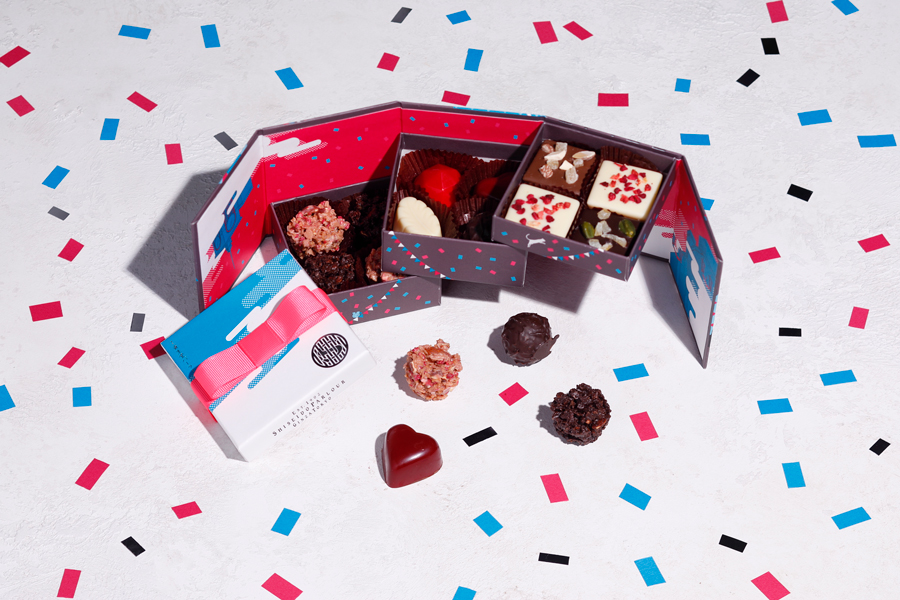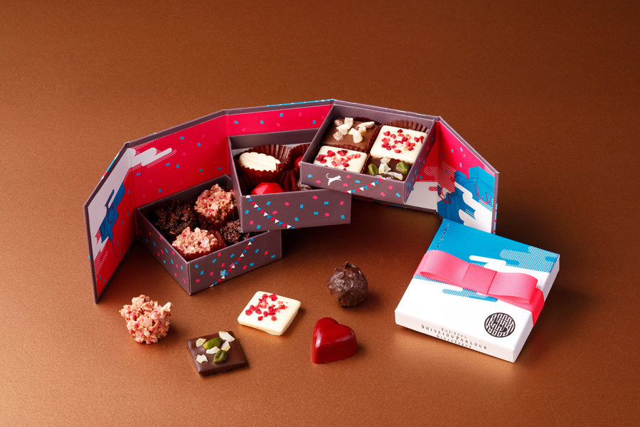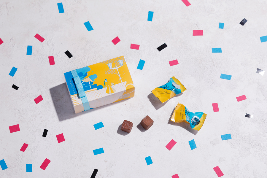 一口ごとに豊かな香りが広がる可愛らしいショコラ。あしらわれたナッツやドライフルーツは、まるできれいな紙吹雪のよう。軽やかにパレードする人びとをイメージしたパッケージ。