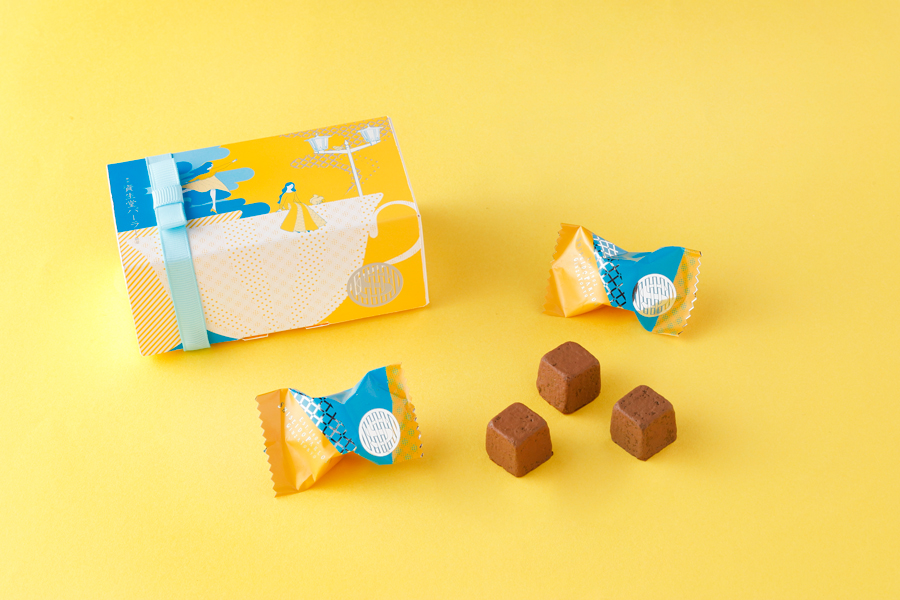 ココアパウダーをまとった小さなキューブ型のショコラ。ミルクチョコレートのまろやかな味わいに包まれます。ティータイムのストーリーが広がるパッケージ。