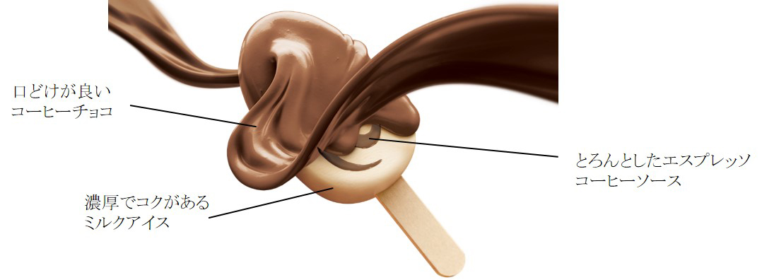 同商品は、本格的な苦みのエスプレッソ・コーヒー・ソースをスパイラル・スタイルで充填したミルク・アイスクリームに、コーヒー・フレイヴァのチョコレートをコーティングし、アフォガートの味わいを表現したもの。2021年3月頃までの期間限定販売が予定されています。