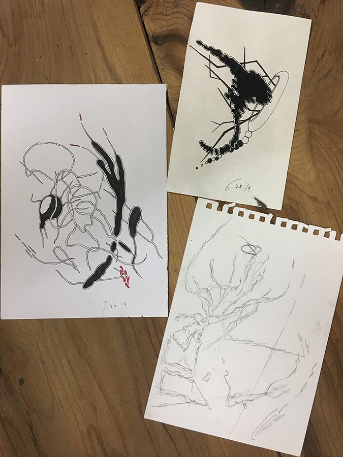 「墨とドローイングを始めたときに許しとか祈りについて色々なことを感じた。職人的なクオリティに憧れもあるけど、今はそれよりも理想とか想像の先にある未知の可能性を持って帰りたい」