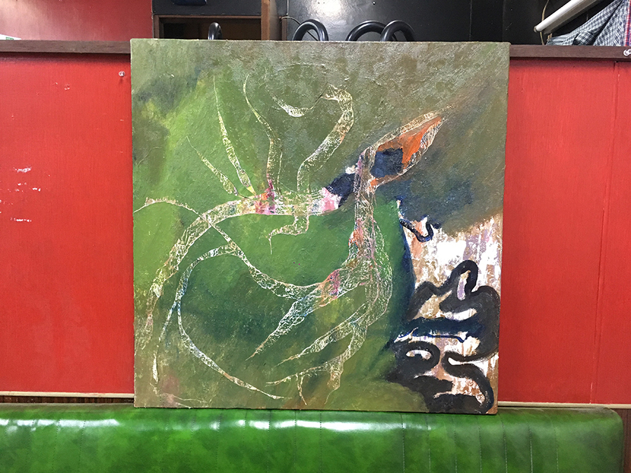「最初は隼士君に色々聞いた。長野に居る時につららとかから得たシェイプのドローイングを続けてて、身体に墨もほぼ毎日増やしてて、なんとなく帰ったら油でデカい絵をべちゃべちゃ描きたいなと思ってた。雪山に飽きたし寒いしで溜まってたフラストレーションをもっとフィジカルに発散したかったんだと思う。それでこっちに帰ってきてまたよく隼士君と遊ぶようになって、彼の家に絵具があったからこれは何?とか聞いて。彼の家に1週間くらいこもったりしてたから絵具の用途とか種類とか、色々聞いた」