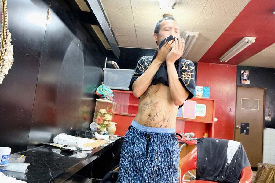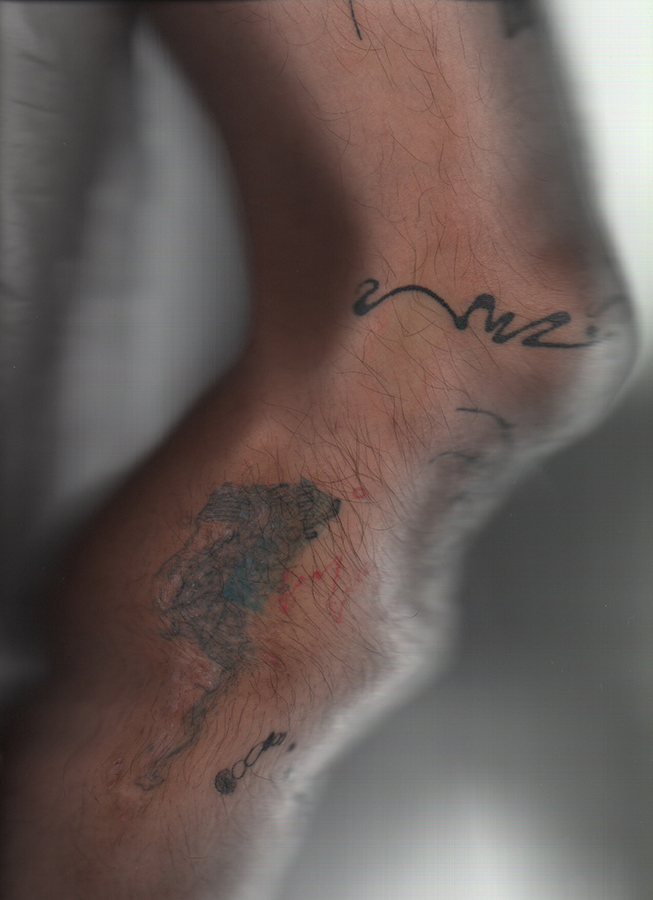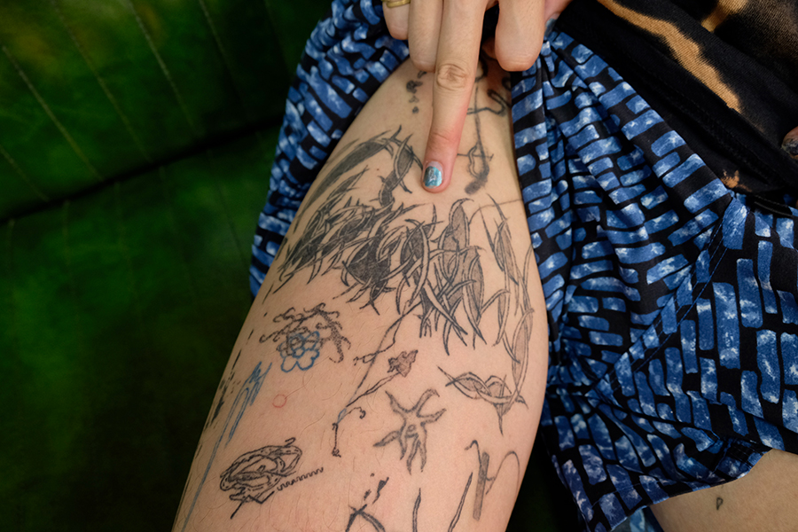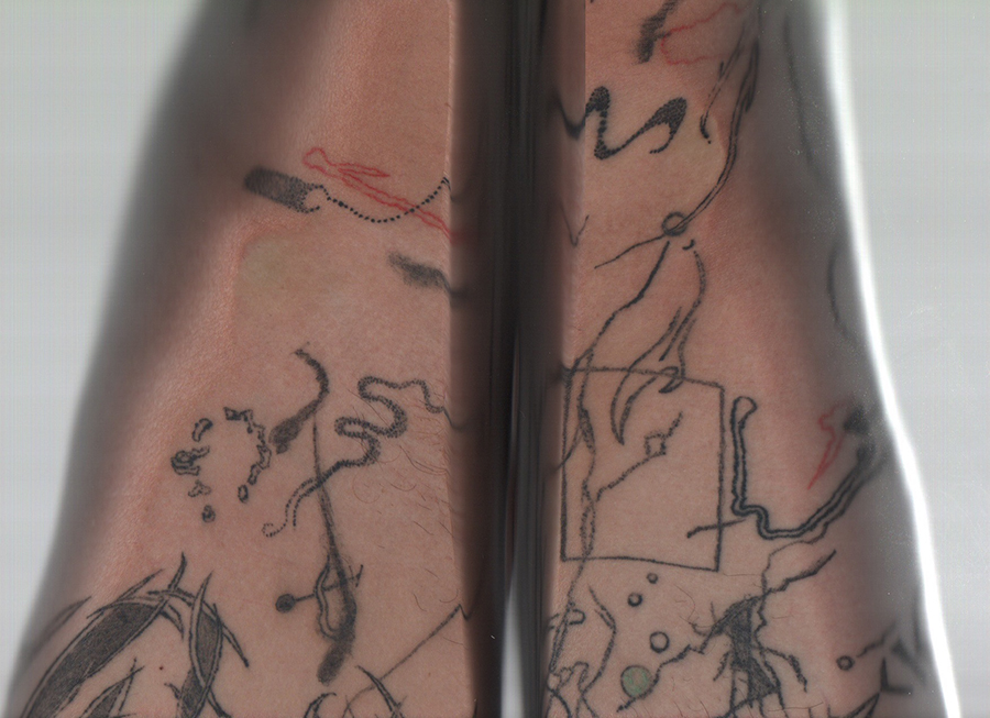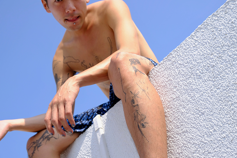 「自分の体に墨を入れたことがきっかけ。2017年くらいから海外のタトゥ・アーティストをよく見てたんだけど、その中でも特に“Studio Straus”っていうエルサレムの音楽とか墨のコレクティヴ周辺が気になってた。特にAuto Christの墨のぐちゃぐちゃなスタイルが良くて。しっかりカチっとしたモチーフじゃないヘロヘロの墨。そのクルーの何人かと連絡取るようになって、彼等のマーチでオレの写真のTシャツとか出したりしてた。そのあと去年の4月にメンバーのYuvalから日本に行くよって連絡が来て。ちょうどNAZEさんと森本(悠生)くんとやっていた“saiaku ni shiteiku”って展示会期中だったから会場のANAGRA(東京・半蔵門)でタトゥのポップアップをやってもらった。そこでYuvalに入れてもらったのが初めての墨」