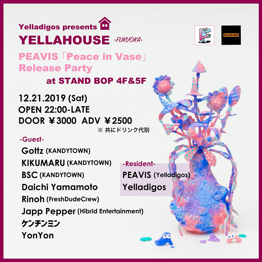 また、PEAVISは12月8日に開催された東京・恵比寿 BATICAでのリリース・パーティに続き、12月21日(土)には地元・福岡の天神 STAND-BOPでもYelladigos主催イベント「Yellahouse」の一環としてリリース・パーティを開催。アルバムにも参加しているJapp Pepper(Hibrid Entertainment)、Rinoh(FreshDudeCrew)、YonYonをはじめ、ケンチンミン、KANDYTOWNからBSC、Gottz、KIKUMARUのゲスト出演が決定しています。