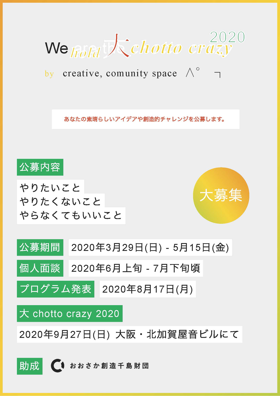 音楽ライヴ、美術展から遠足まで、様々な企画を手掛ける大阪・西天満の異色コレクティヴ「creative, community space ∧°┐」が、9月27日(日)に大阪・北加賀屋 音ビル周辺で開催するイベント「大 chotto crazy 2020」の企画を特設サイトにて募集中。