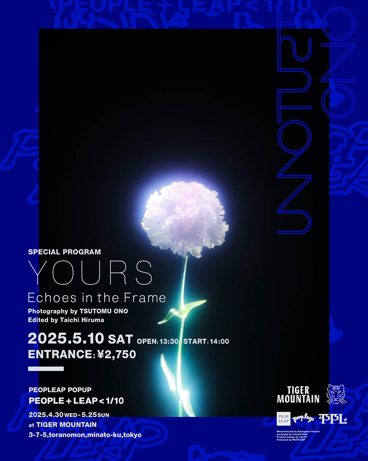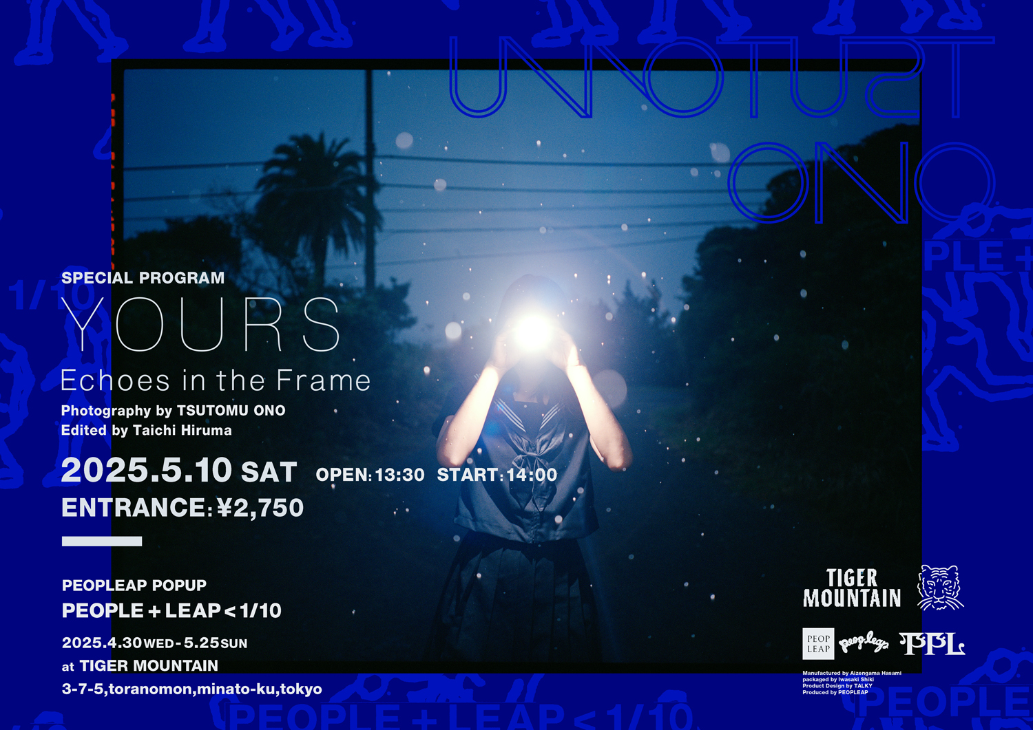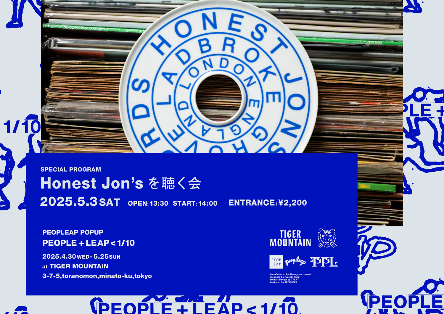 会期中の5月3日(土)には、PEOPLEAPが昨年11月に発表した英ロンドンのレーベル / レコードショップ「Honest Jon's Records」とのコラボレート・アイテムの発売を祝して、Twothと若林が登壇するリスニング・イベント「Honest Jon'sを聴く会」をTIGER MOUNTAINと同B1F「黒鳥福祉センター」にて開催。10日(土)には、比留間太⼀(PEOPLEAP)が写真家・オノツトムのプライベート / 未公開写真を編集し、スライドショー形式で上映する「YOURS – Echoes in the Frame」が黒鳥福祉センターにて開催されます。
