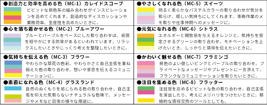 1色のマルチカラー製品を4色ずつ8つの組み合わせで分類したふせん(75㎜×25㎜)が、小分けされています。