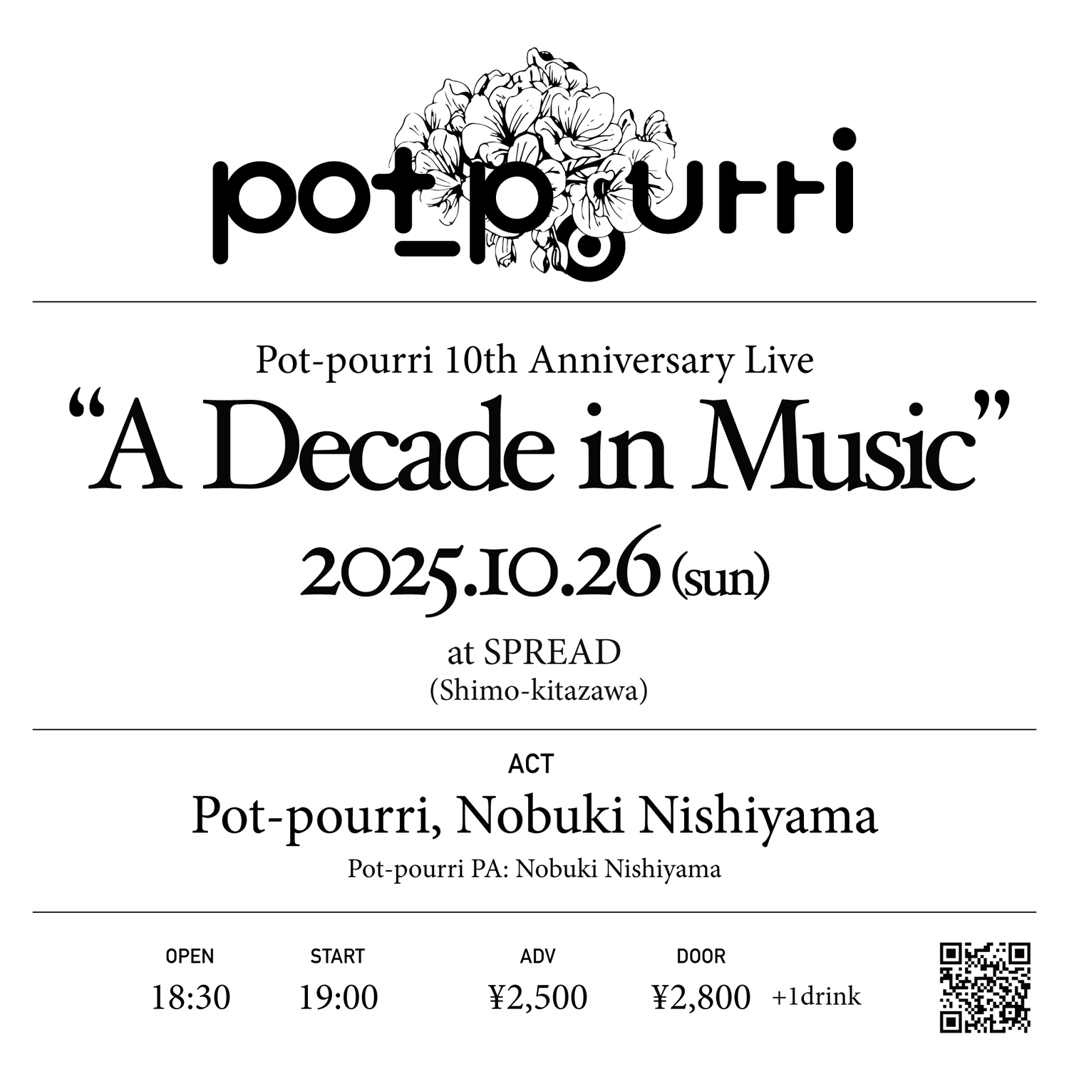 2月発表の最新フル・アルバム『Eraser, Pencil』が好評を博しているPot-pourriが、初ライヴから10年目を記念した公演「A Decade in Music」を10月26日(日)に東京・下北沢 SPREADにて開催。フォームでの予約受付が開始されています。