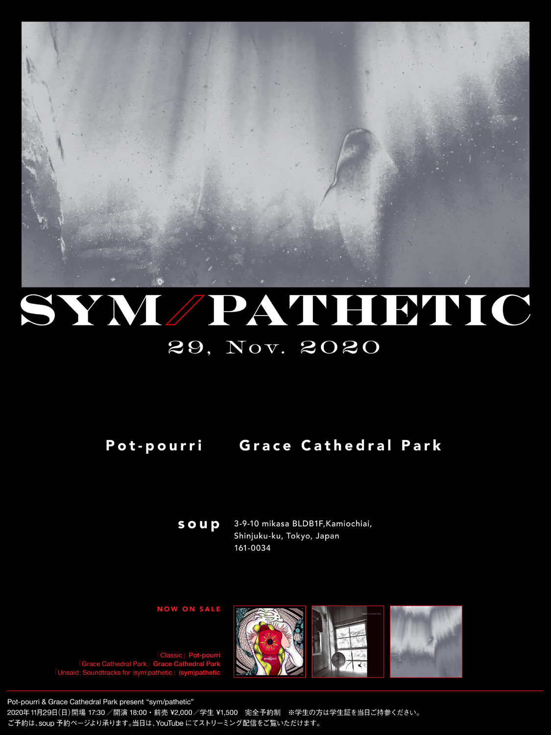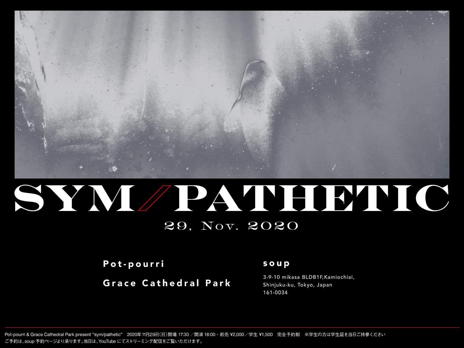 この度わたしたちPot-pourri・Grace Cathedral Parkは、今年3月15日(日)に開催を予定していた共同主催イベント「(sym)pathetic」の代替公演として、「sym/pathetic」を2020年11月29日(日)、落合soupにて開催させていただくこととなりました。