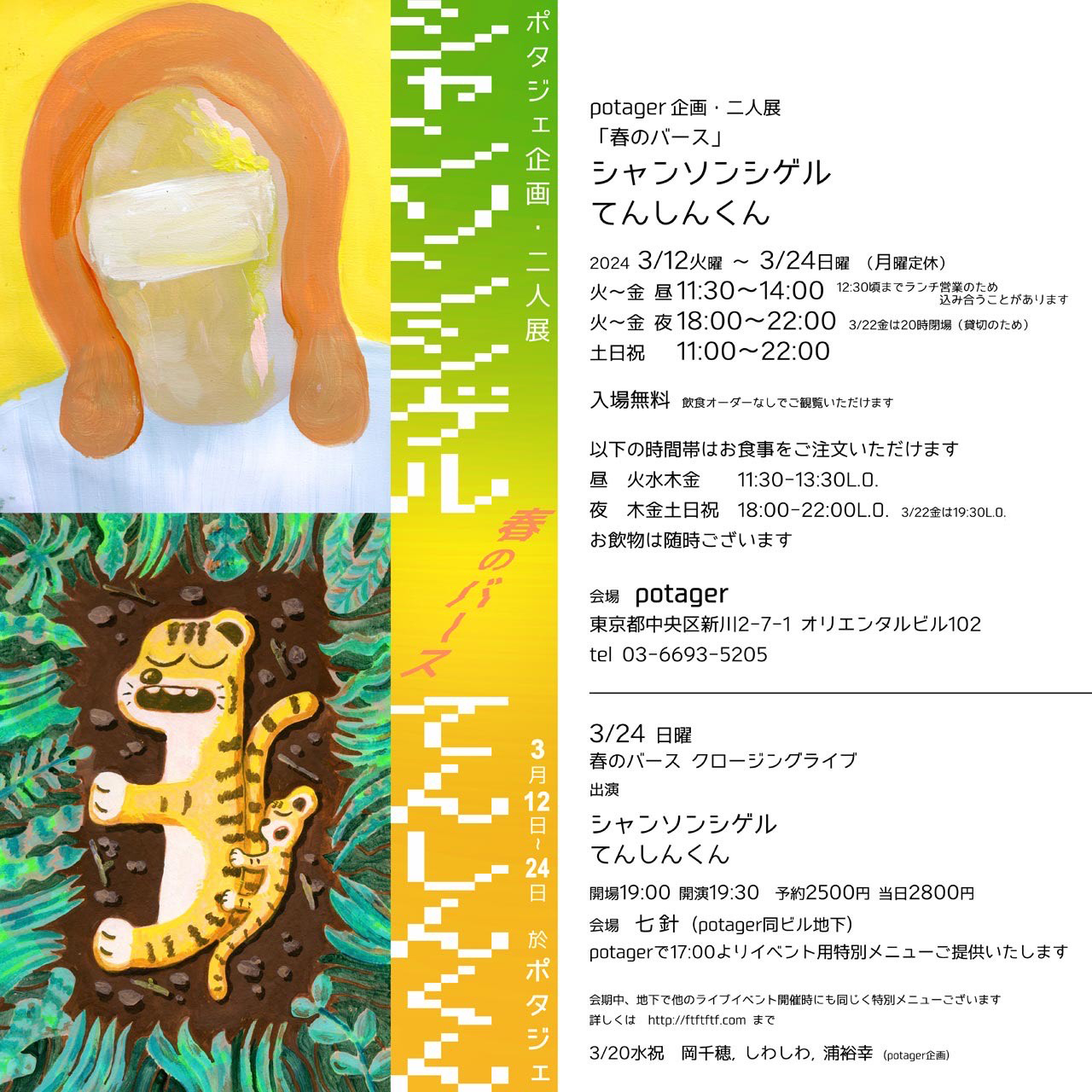 同展では、各々が絵画を新旧作織り交ぜて展示販売。シャンソンシゲルの出展作品にはGELLERS、トクマルシューゴらのカヴァー・アート原画が含まれています。最終日の3月24日(日)には、potagerの階下に構えるライヴ・スペース「七針」にて、両者が出演する「春のバース クロージングライブ」も開催。